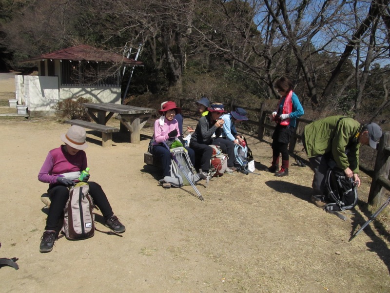 *この日は1035-50浄因寺で休憩(標高約300m)→1125-35石尊山見晴台(標高442m)→1210-20毘沙門天でトイレ休憩(標高約350m)→1310-20休憩(標高約200m)→1355-1405両崖山山頂(標高251m)→1450-1500織姫神社(標高約100m)