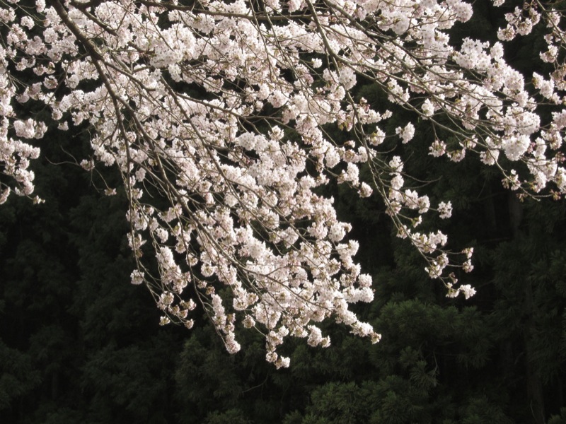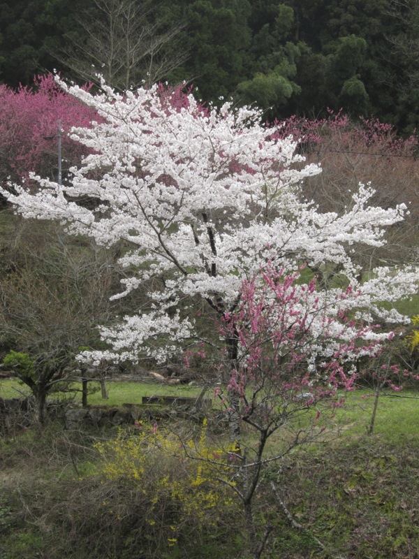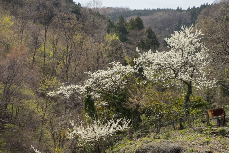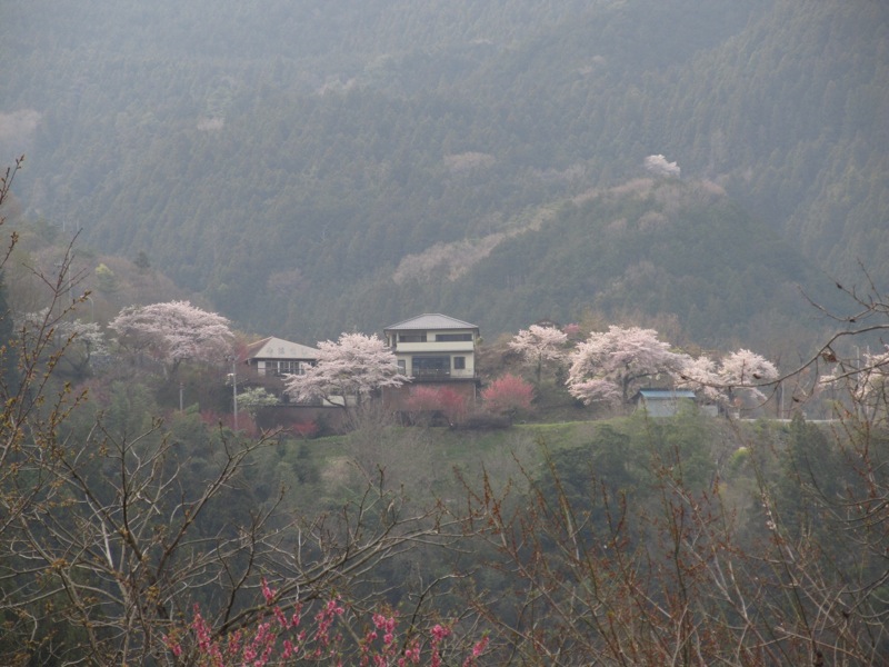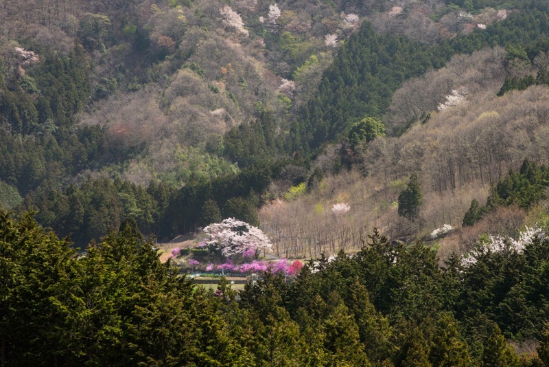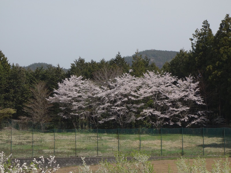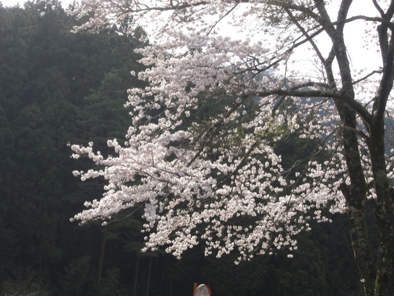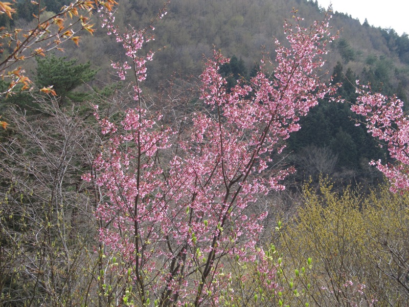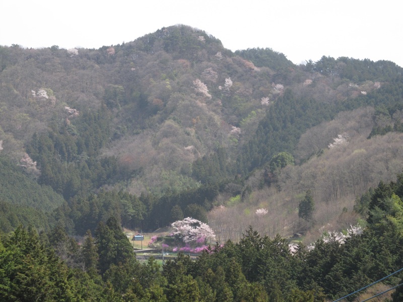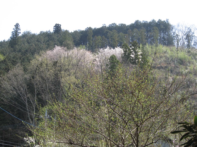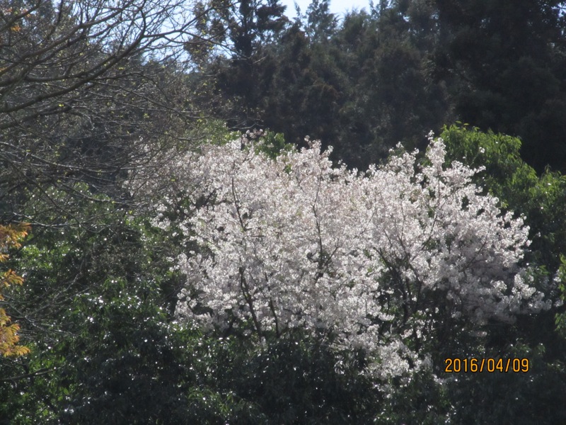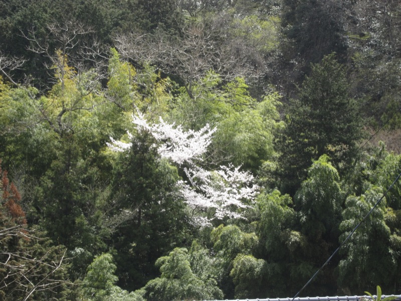 かなり離れた山の斜面にサクラの木が1本、明るく輝いていました。ヤマザクラより賑やかな雰囲気です。
