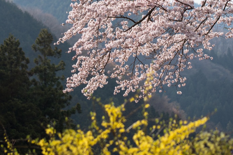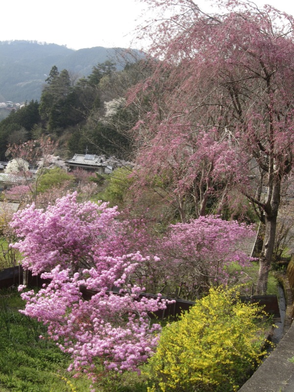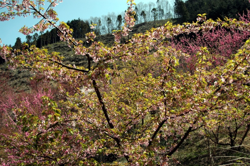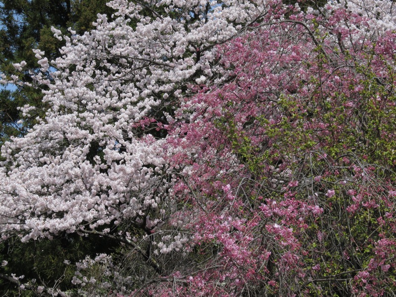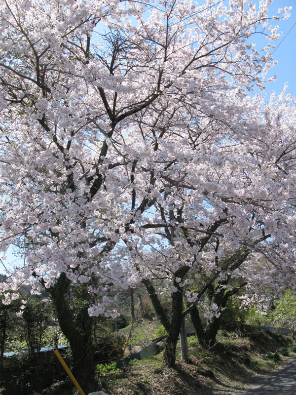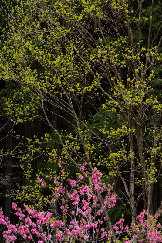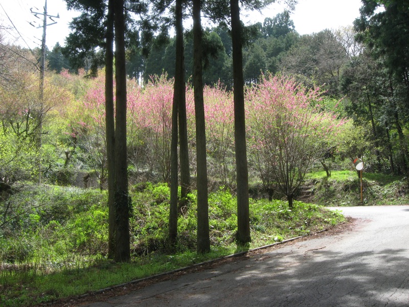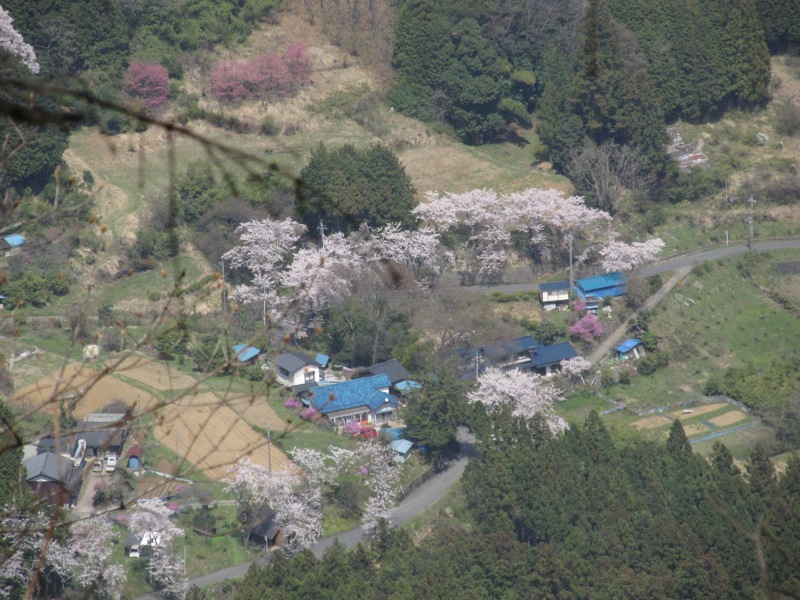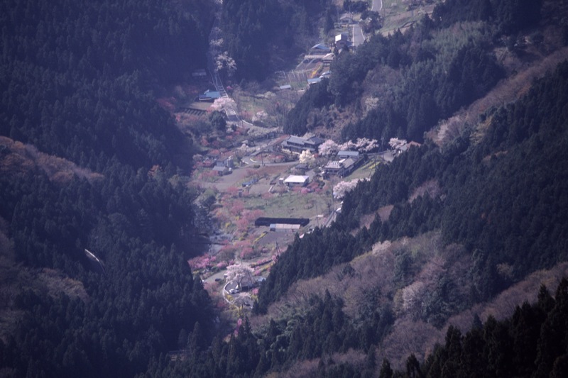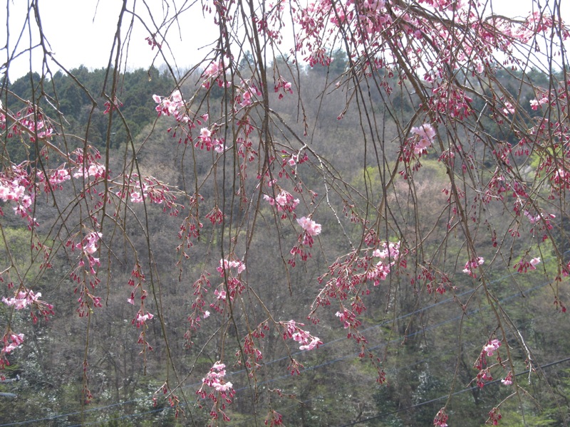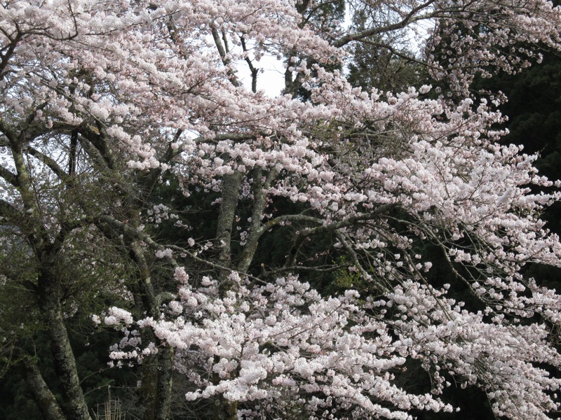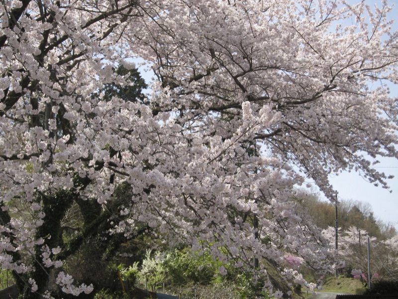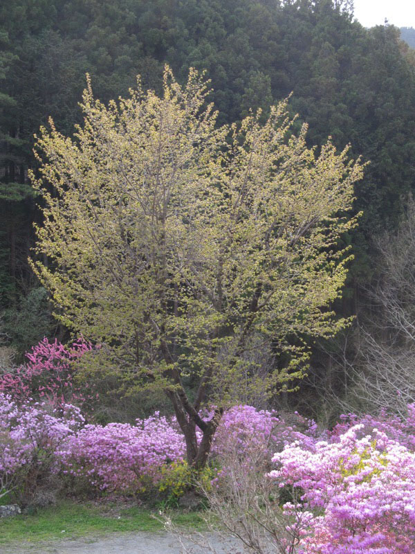 かなり離れた山の斜面にサクラの木が1本、明るく輝いていました。ヤマザクラより賑やかな雰囲気です。