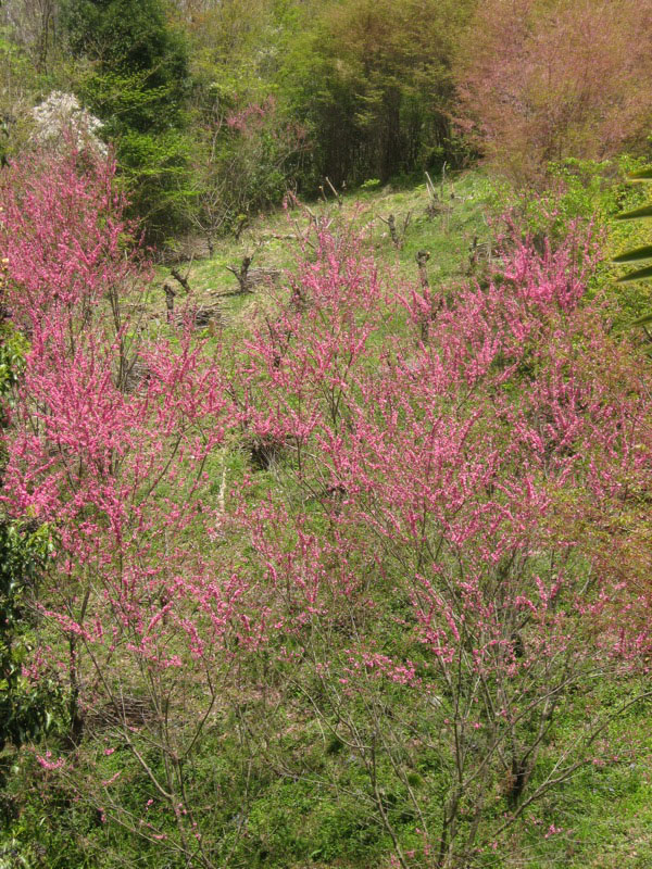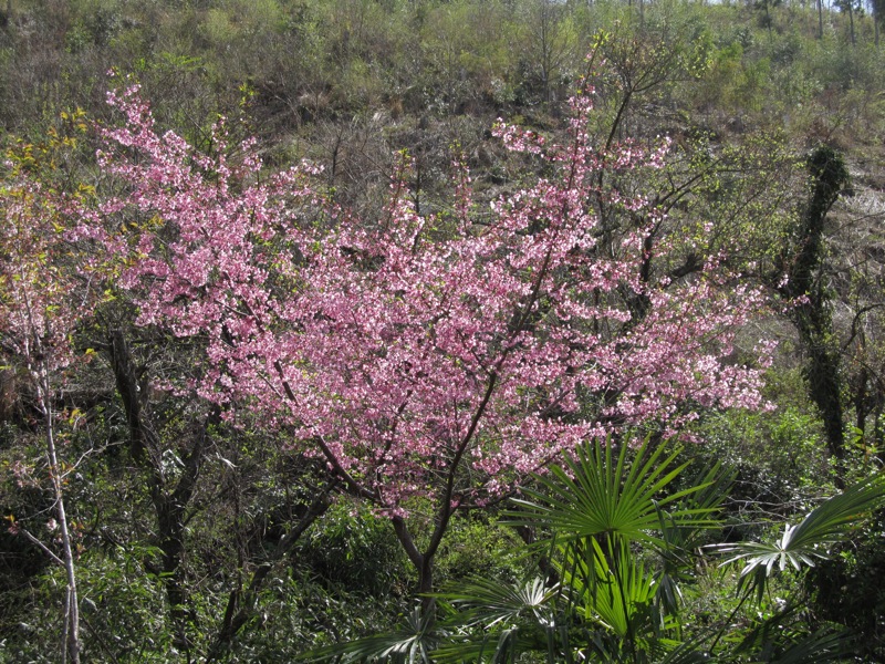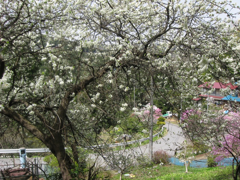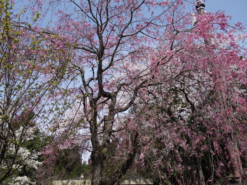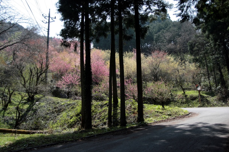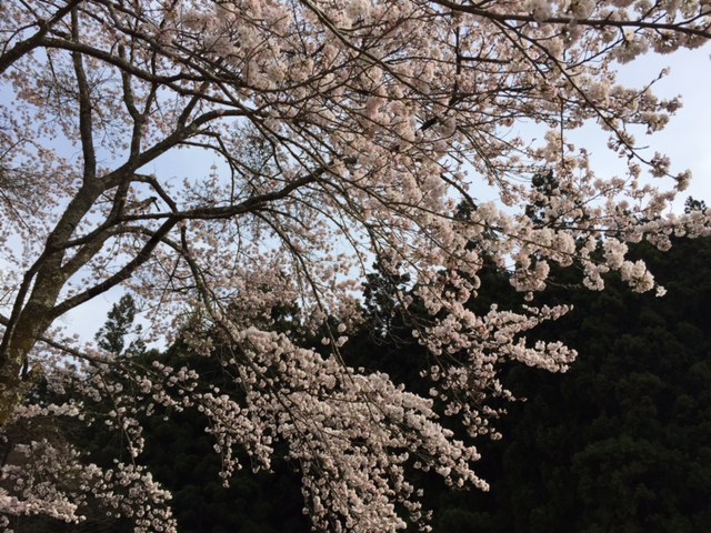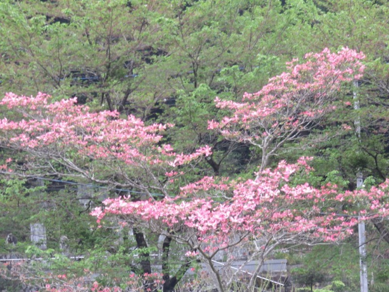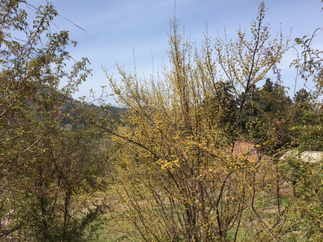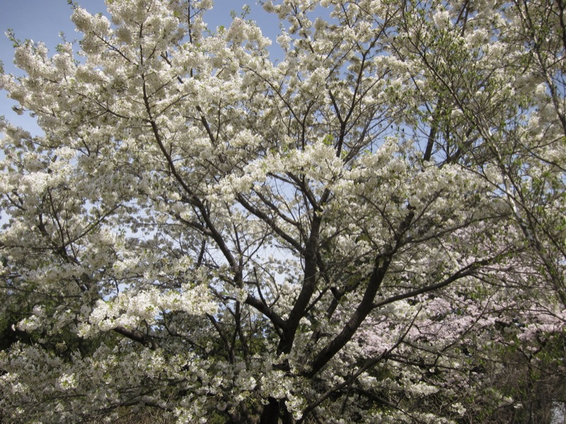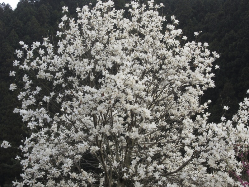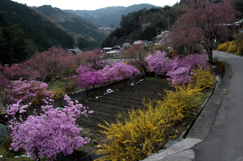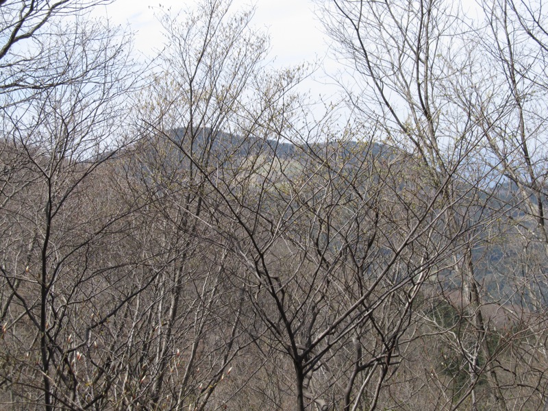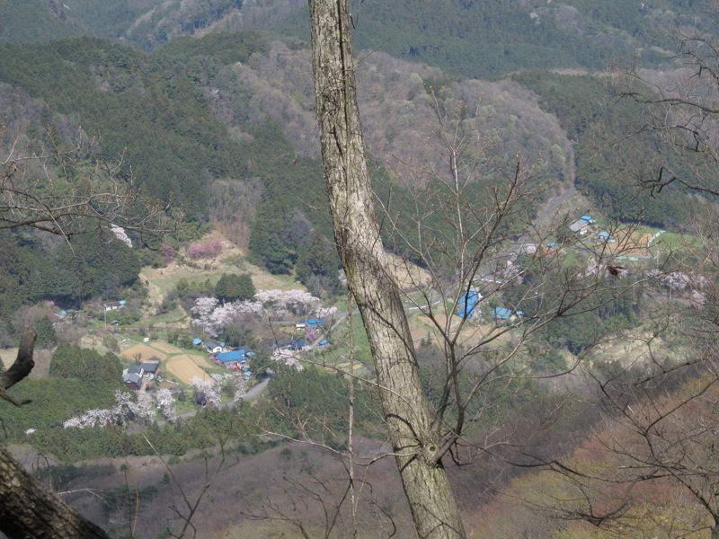 かなり離れた山の斜面にサクラの木が1本、明るく輝いていました。ヤマザクラより賑やかな雰囲気です。