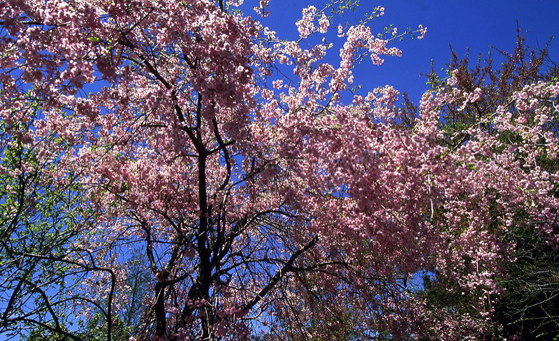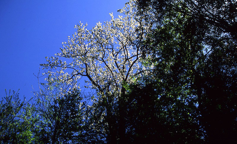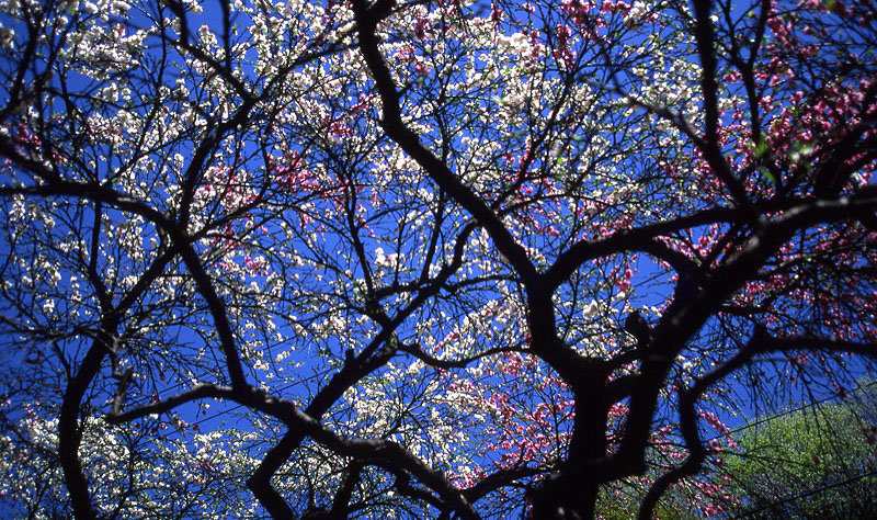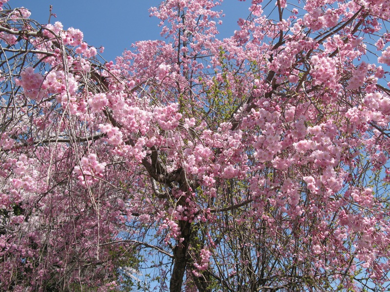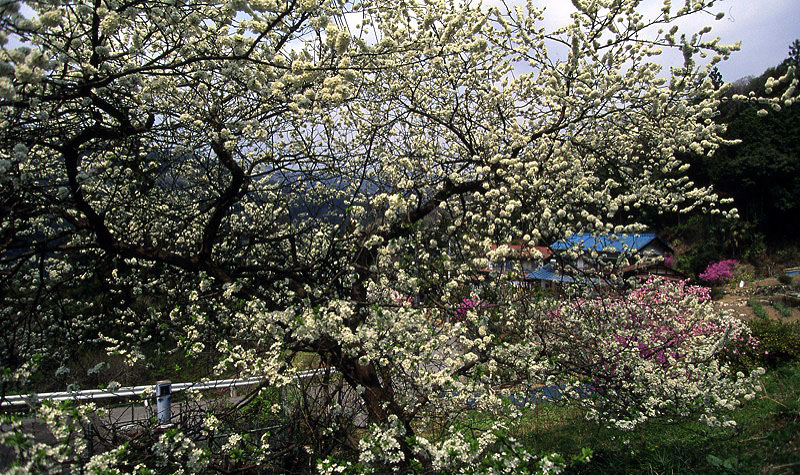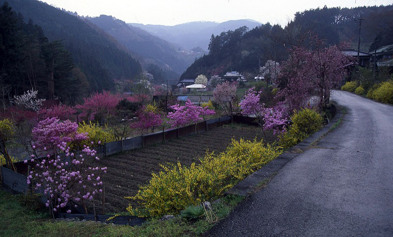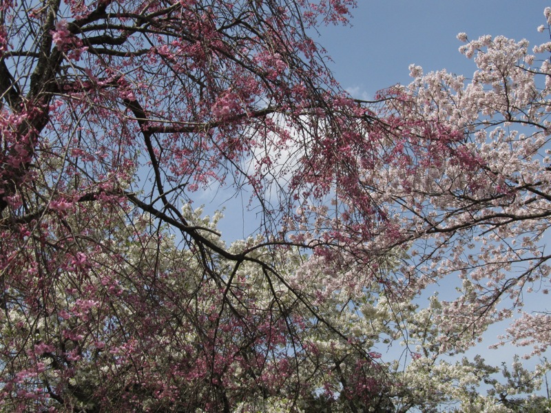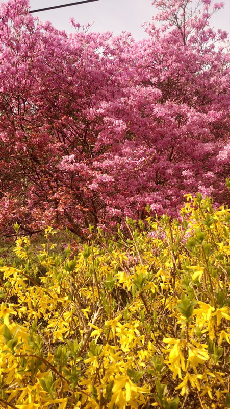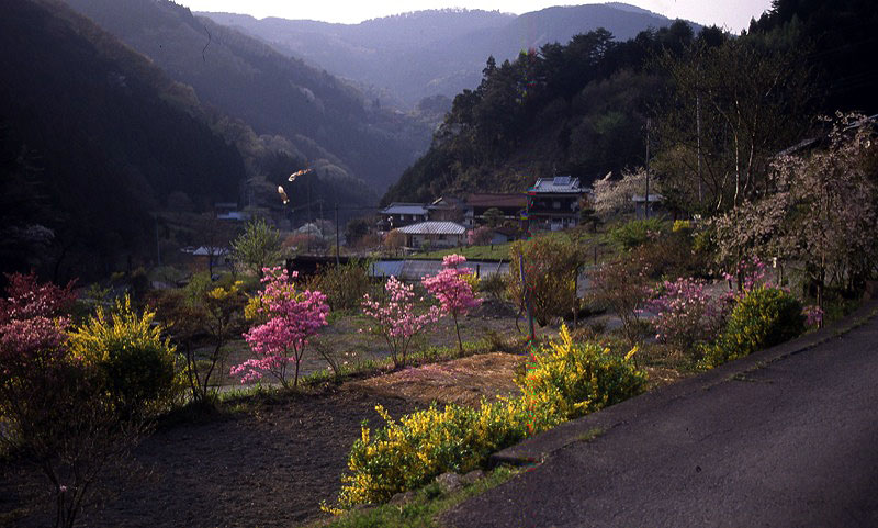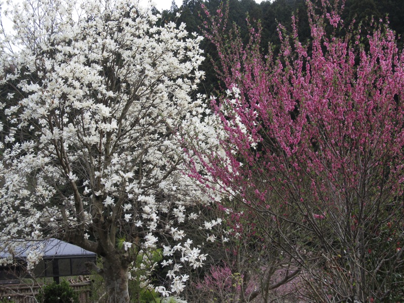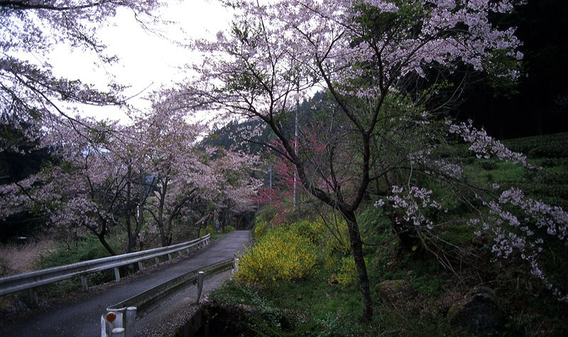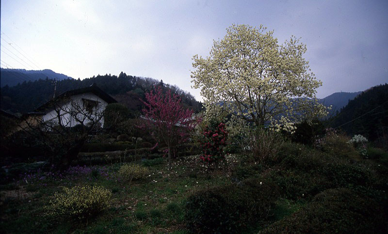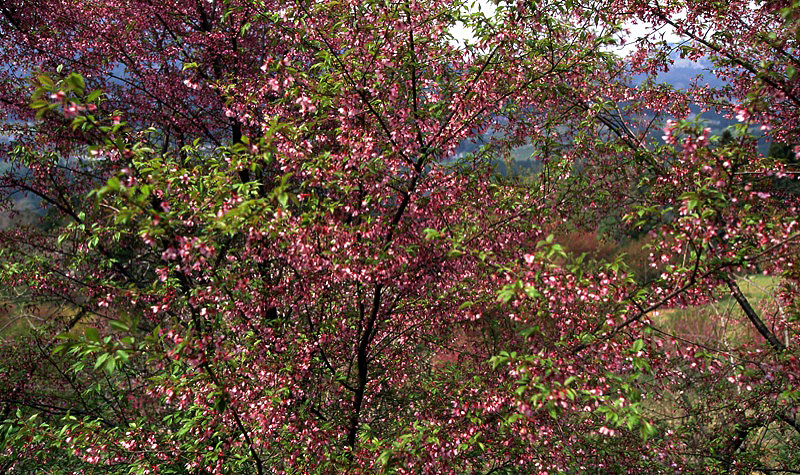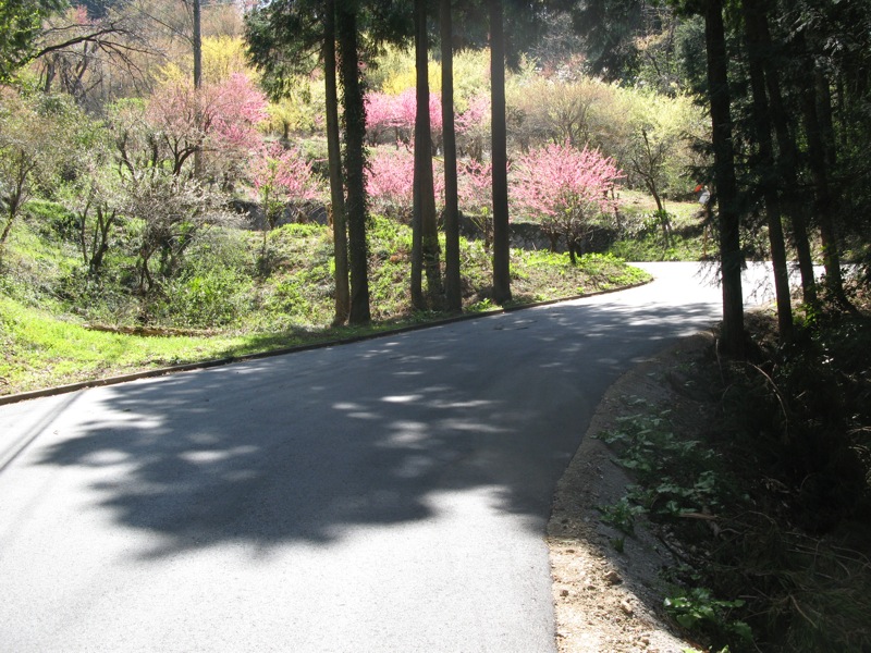 かなり離れた山の斜面にサクラの木が1本、明るく輝いていました。ヤマザクラより賑やかな雰囲気です。