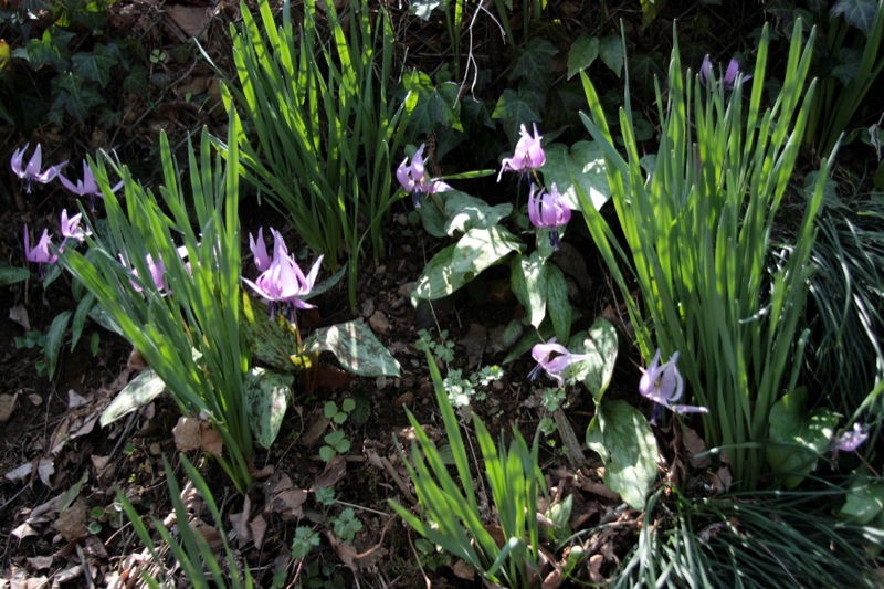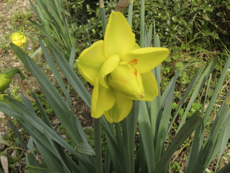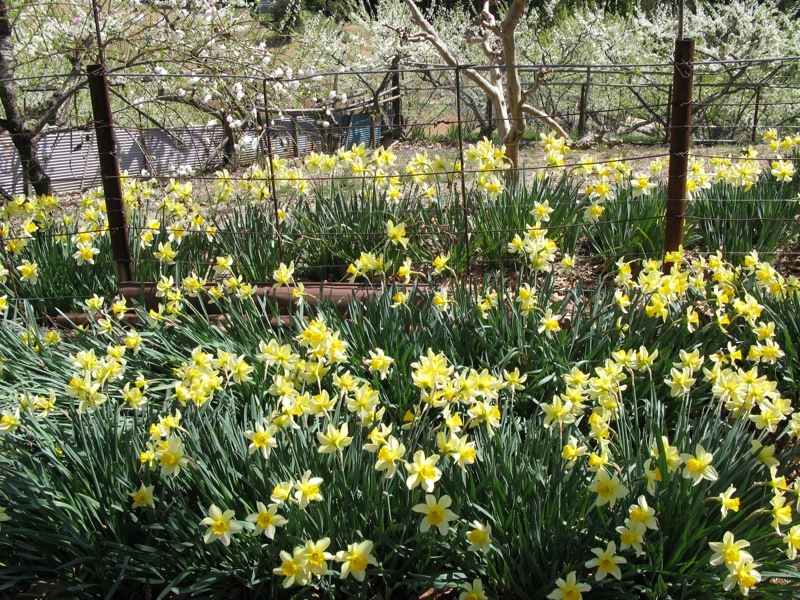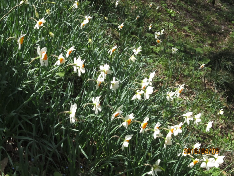 スイセンの花が向いているのはおおよそ南〜西だと思うのですが、ここでは背後、上から陽光を浴びています。エッ? なんでアッチを向いているのだろうと思って撮った記憶があります。