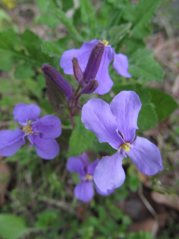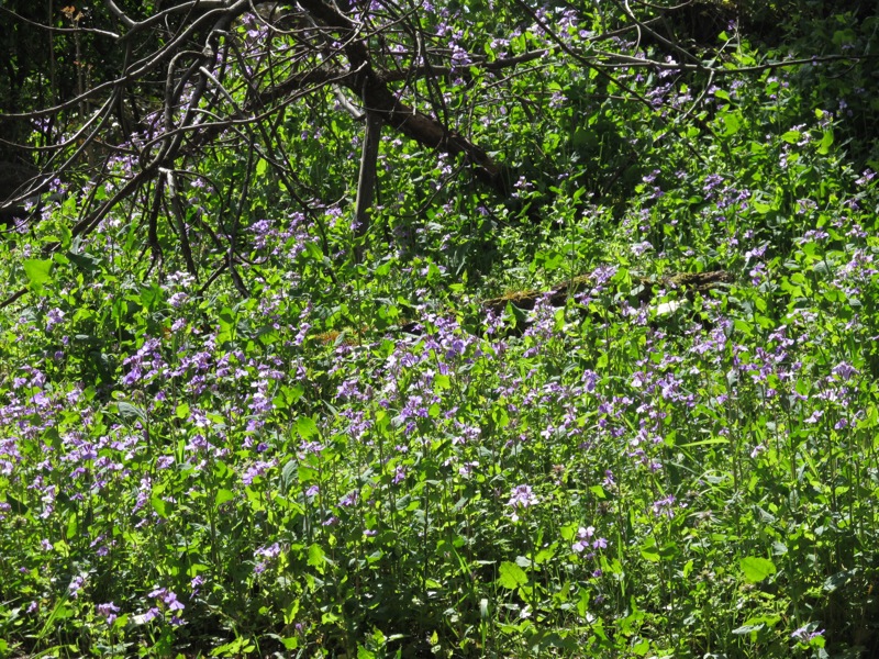 しかしこれはアブラナ科ショカツサイ属という場合。同時にアブラナ科オオアラセイトウ属ともされて、オオアラセイトウ(大紫羅欄花……私には読めません)という名前があります。さらに別名としてムラサキハナナ(紫花菜)も。どうして別名がたくさんあるのかというと、エゾスズナ属のハナダイコンがあるから……でしょうか。こちらには別名がないので、その一本気がかえって強い、のかもしれません。