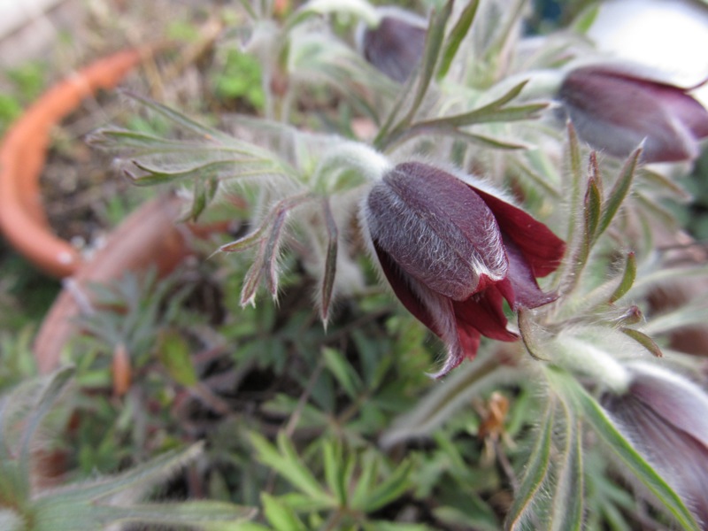 アケビ(木通)です。この写真では分かりませんが、同じ株に雄花と雌花が付いてます。3枚の花弁のようなガクの中に雌蕊が6−9本バナナの房のようについているのが雌花、ゲンコツを握ったような形に6本の雄蕊が塊になっているのが雄花。どこにでもある蔓性の落葉低木で、このアケビの花はフレッシュで色が鮮やかなので目に留まりましたが、地味な色なので見過ごされがちです。実は食べられるようです。
