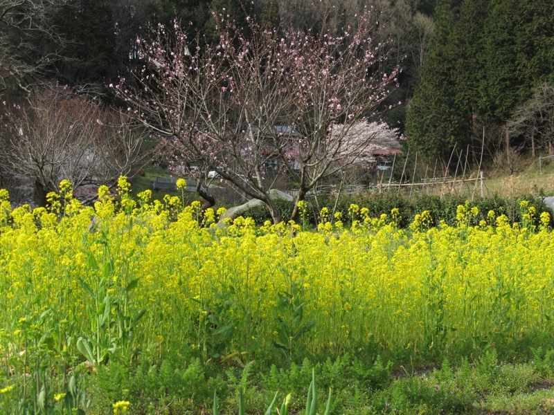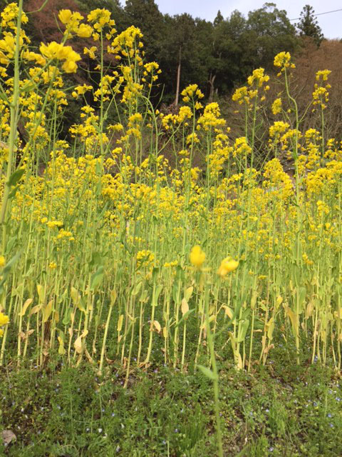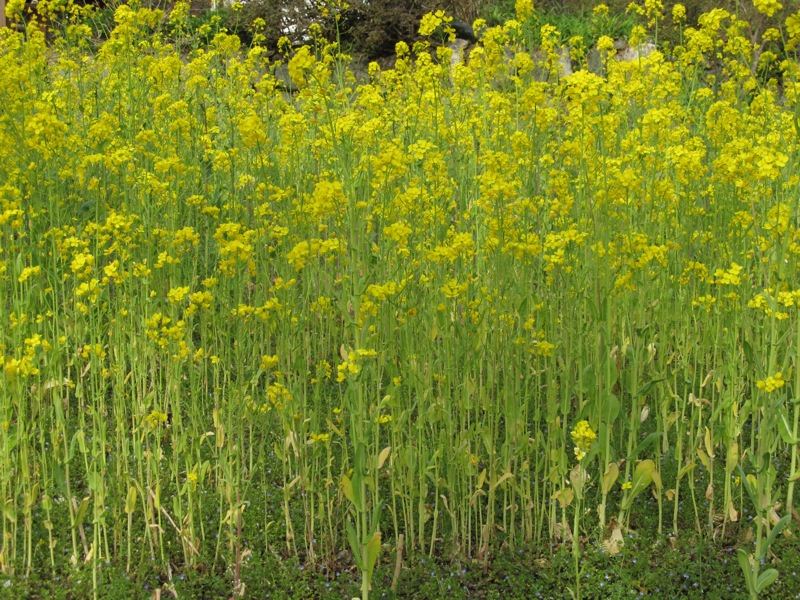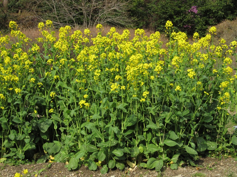 菜の花なんでしょうが、文字どおりなら食べられる菜っ葉の意。アブラナ(油菜)科のナタネ(菜種)が代表だけれど、アブラナ科アブラナ属の花の多くが菜の花を咲かせるというのです。カラシナ、コマツナ、カブ、ハクサイ……。3月に奈良で初めて見たけれど、キャベツだって菜の花を咲かせますから。