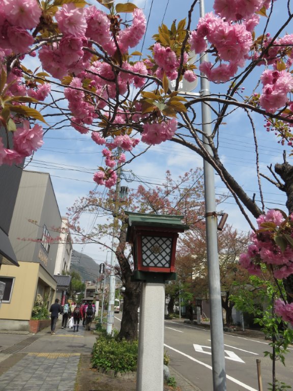 弥彦駅から 弥彦神社へ歩いていく途中の通りを八重桜が飾っていた。