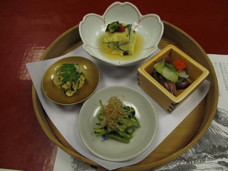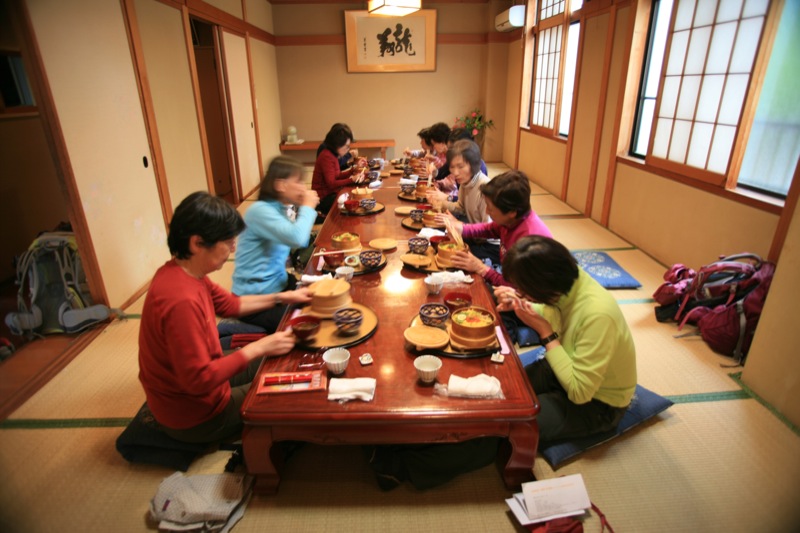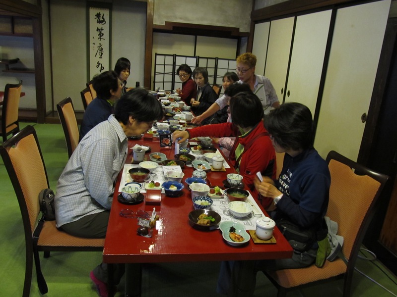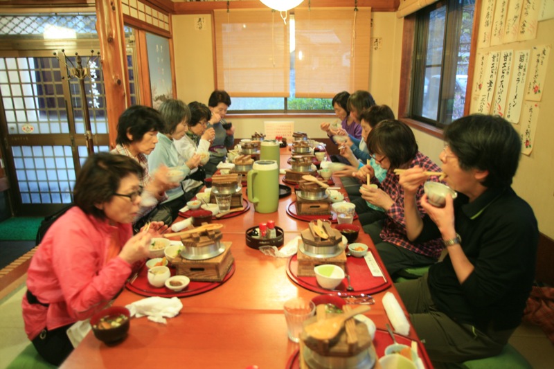 昼食は「わっぱ飯」の吉田屋で。11人で直接訪れるとものすごく迷惑そうな顔つきで「わっぱ飯なら」と。この人数で食事をしたいなら前日に予約が必要というのが弥彦村の常識だということで、翌日には、一時間前の打診に対して夕食を断られてしまいました。でも、山のグループは不用意な予定に縛られたくないので……どうしても直前の問い合わせになってしまいます。