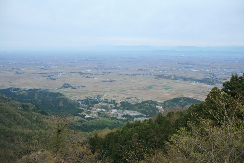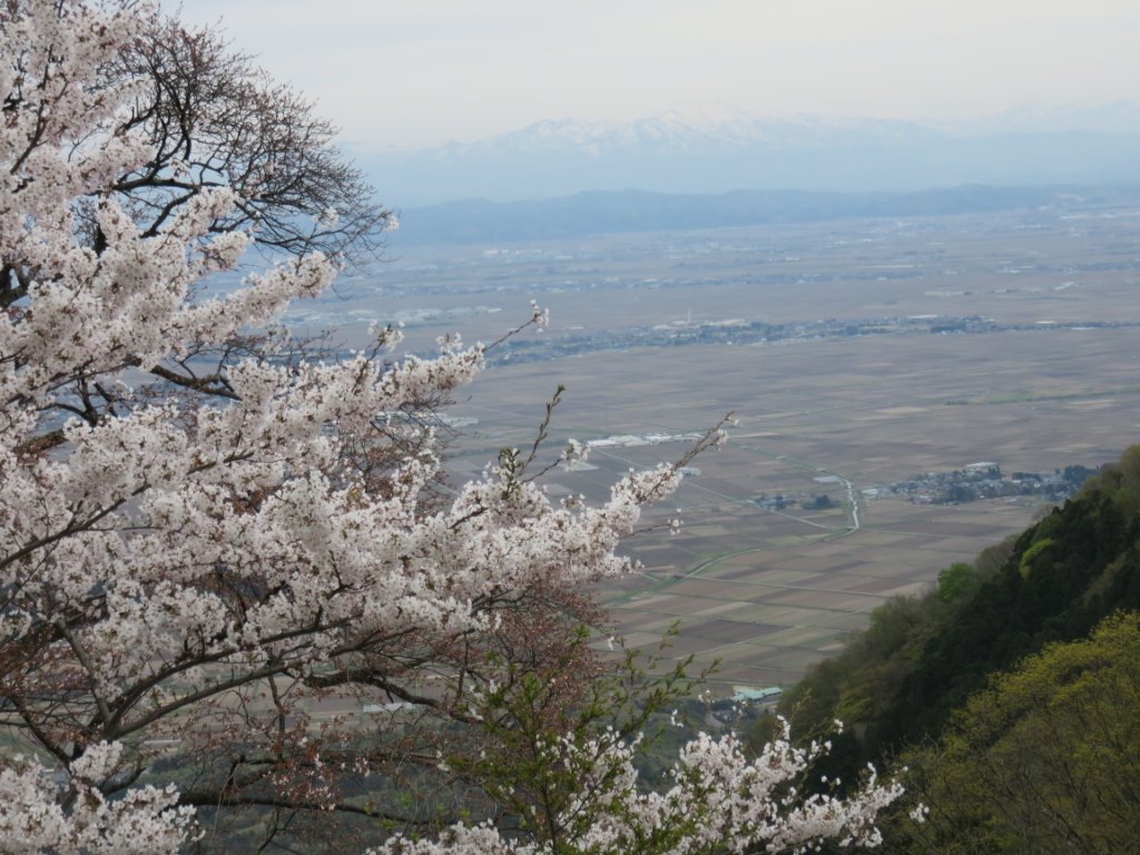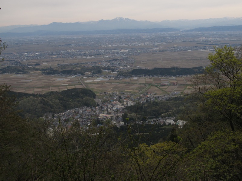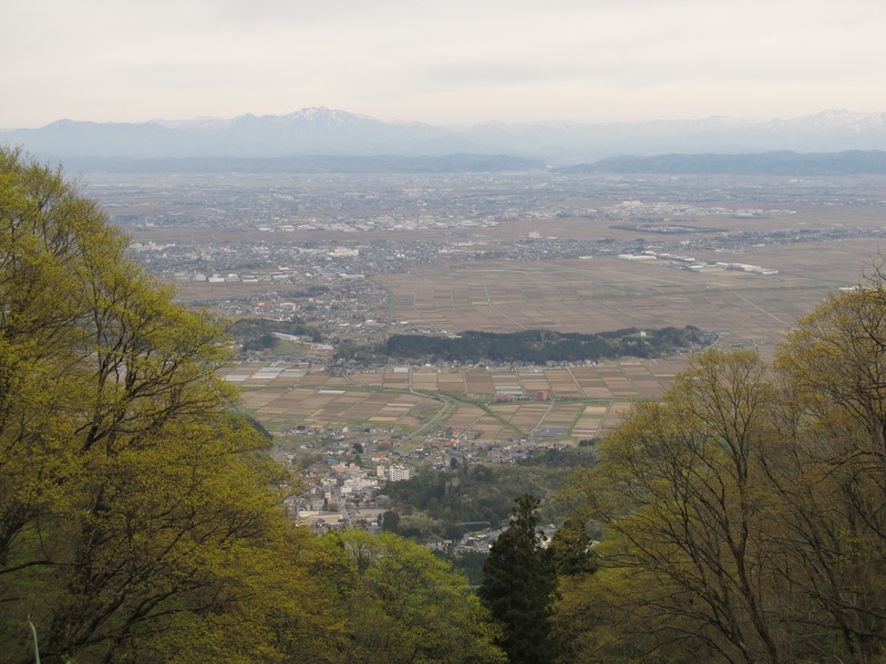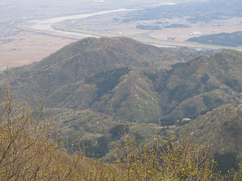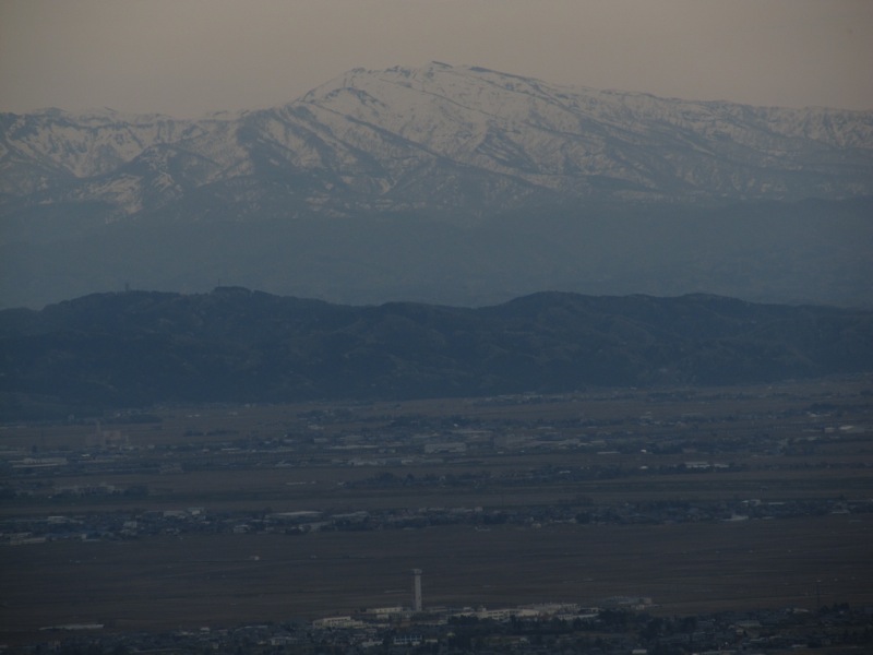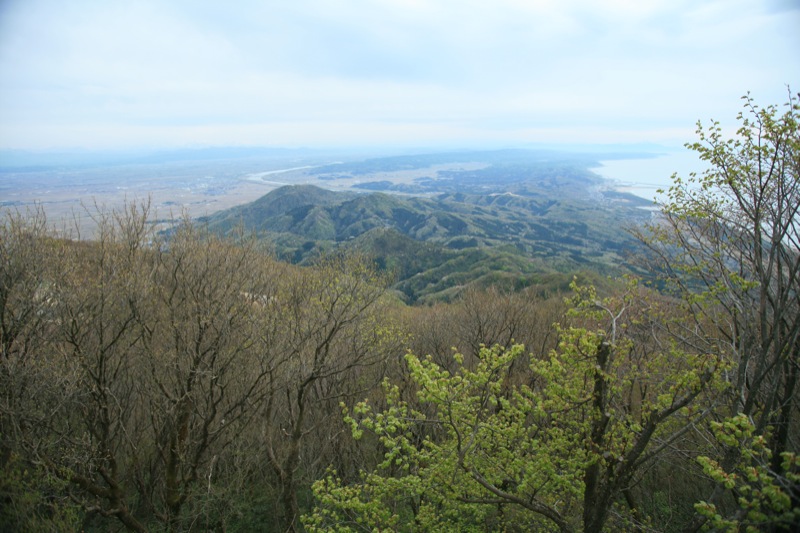 山頂から南を眺めています。弧を描いた白い線が信濃川で、キュッとまがって日本海に向かっているのは大河津分水路。信濃川はまっすぐに左手に延びて、新潟中心街で日本海に注ぎます。その分水路の手前にある緑のピークが昨日登った国上山です。左手奥にはまだ完全に冬山の峰がいくつも見えましたが、上越新幹線沿線の、谷川岳にいたる山々だとわかりました。
