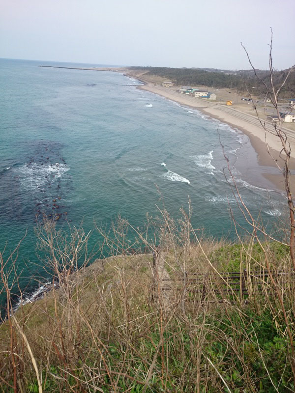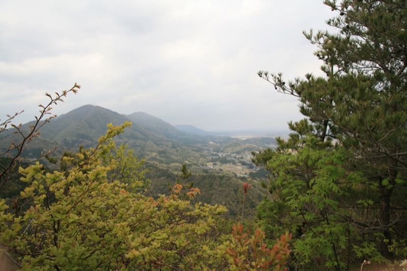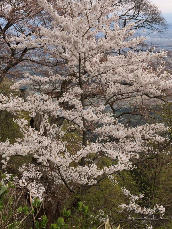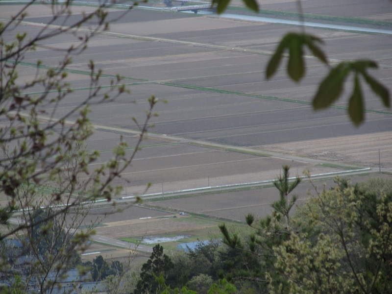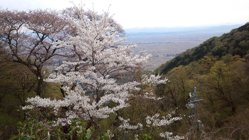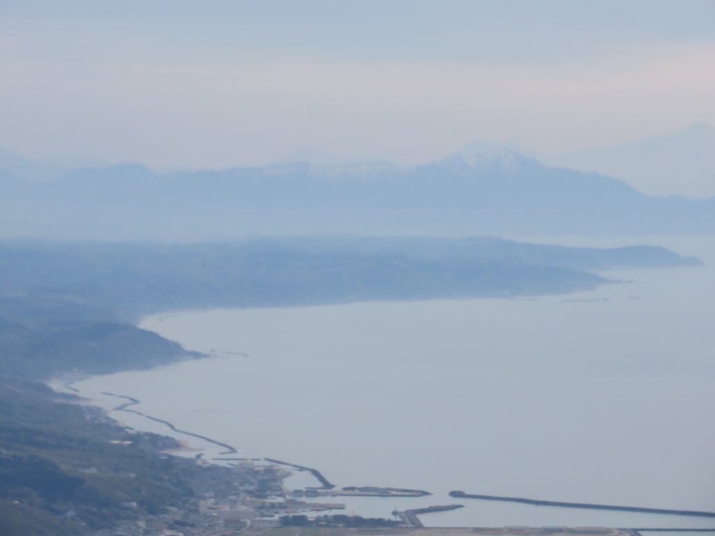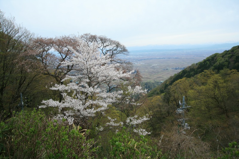 山頂から南を眺めています。弧を描いた白い線が信濃川で、キュッとまがって日本海に向かっているのは大河津分水路。信濃川はまっすぐに左手に延びて、新潟中心街で日本海に注ぎます。その分水路の手前にある緑のピークが昨日登った国上山です。左手奥にはまだ完全に冬山の峰がいくつも見えましたが、上越新幹線沿線の、谷川岳にいたる山々だとわかりました。