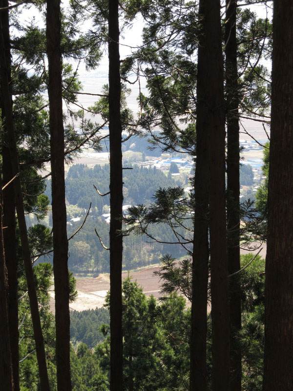 ここは六合目の石柱のちょっと上。足元が弥彦村の中心街で、その先はもう燕市の吉田。JR弥彦線は向こうへと延びていますが、吉田ではJR越後線が左右に延びています。左手の、昨夜泊まった岩室温泉は新潟市ですし、昨日登った国上山は三条市。弥彦山の山すそに身を寄せ合っている弥彦村という感じがします。