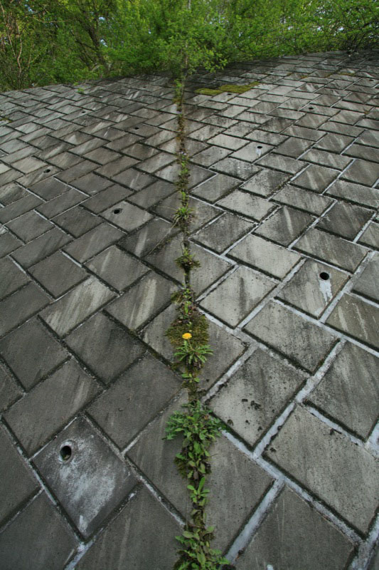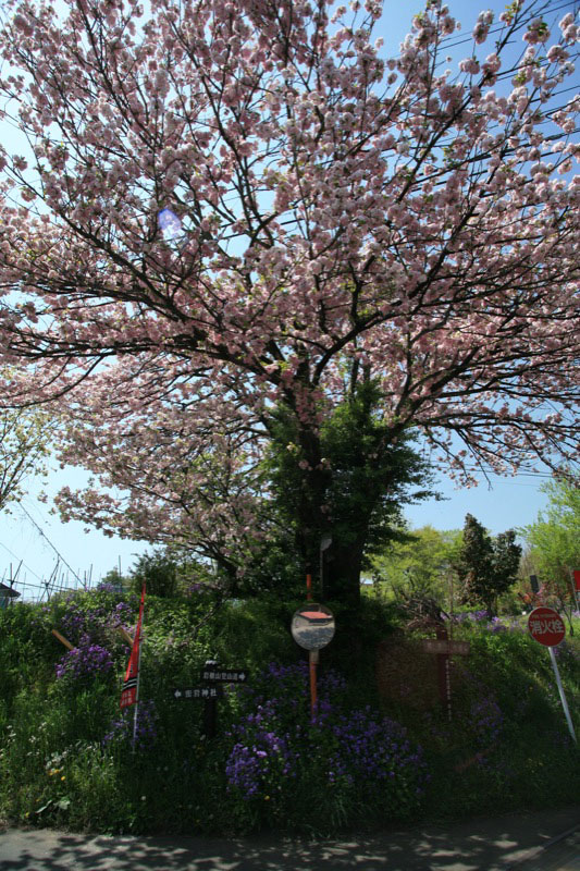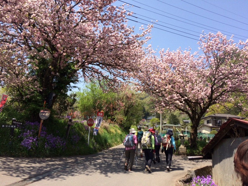 八重桜のトンネルを抜け登山口へ。足元にはハナダイコン。