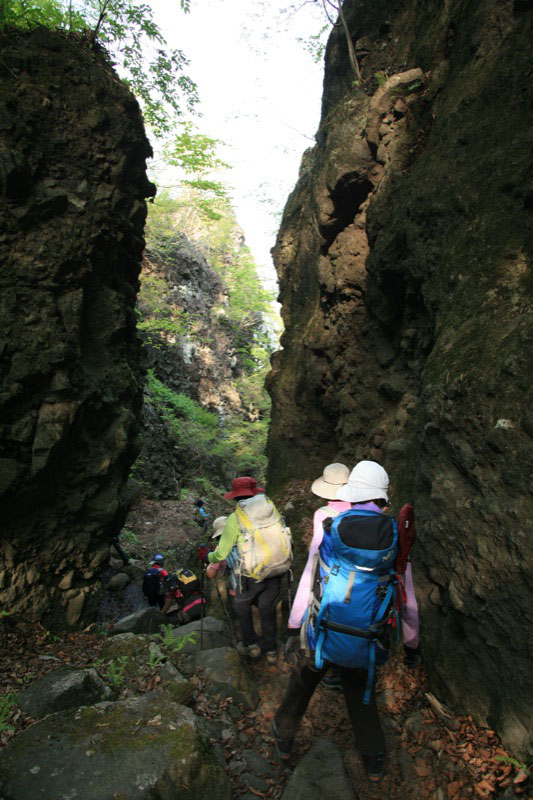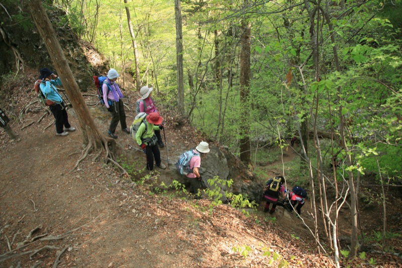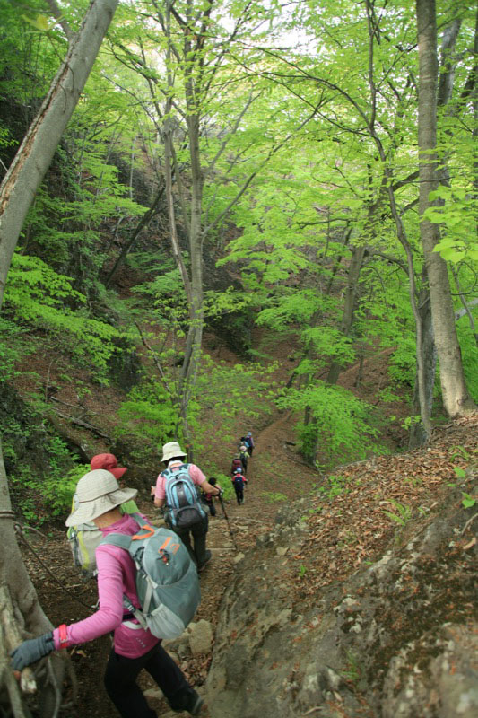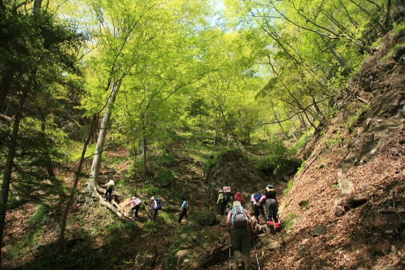 この日は1205にJR吾妻線・郷原駅(標高約400m)を出発し、1230−35登山口(標高約500m)、1310-20稜線(標高約700m)で休憩。1345-50稜線で休憩、1435-50岩櫃山山頂(標高803m)、1610-20平沢登山口でトイレ休憩、1650岩櫃城温泉。