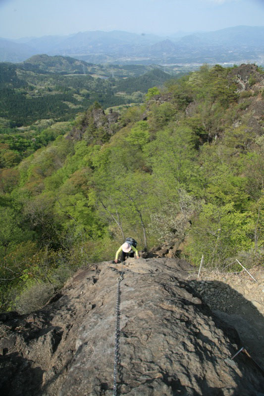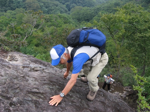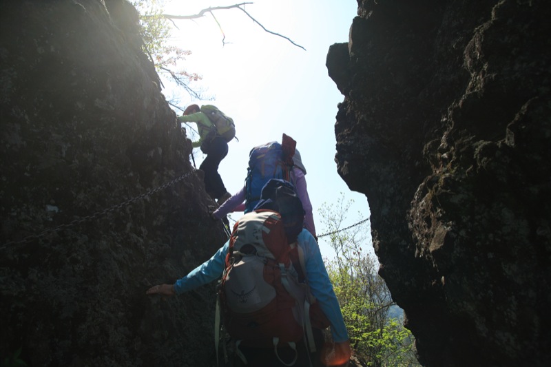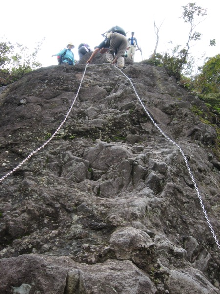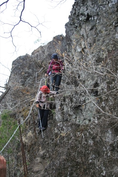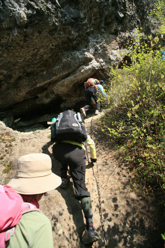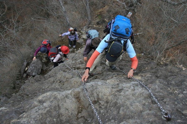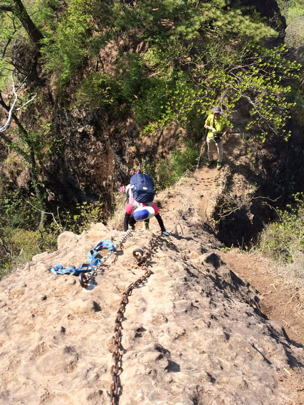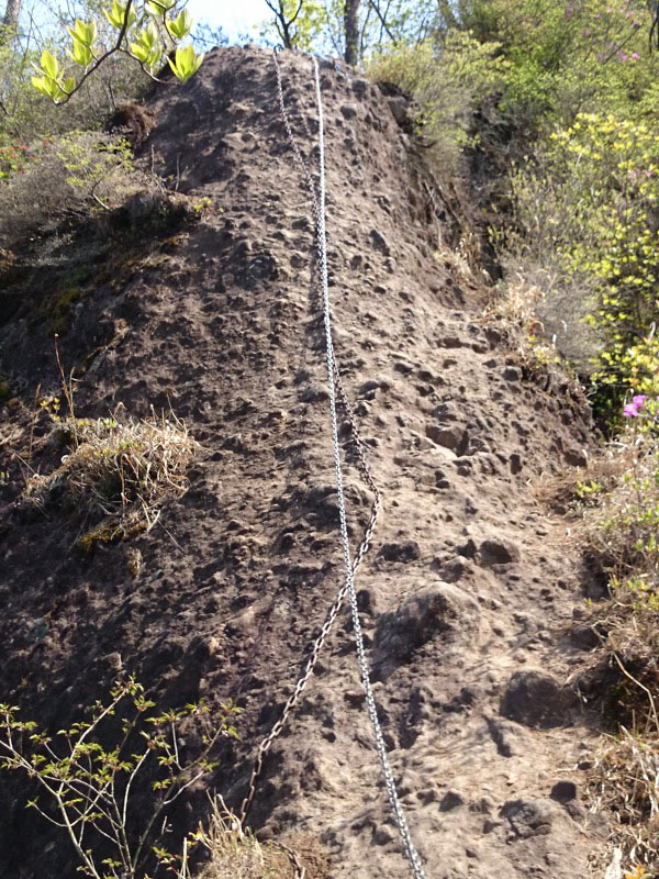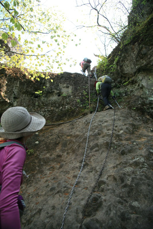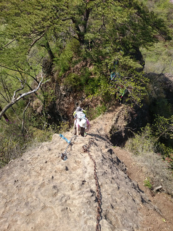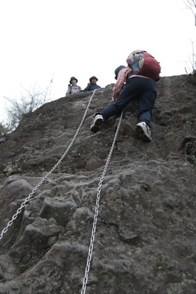 *でした……というのは、この山が今、転落事故の多発する危険な山になってしまったらしいのです。私たちが登ったすぐあとでも、死亡事故が起きています。どうしてなのか具体的なことはわかりませんが、「スリリングだけど危険は少ない」ということは、クサリによって安全は確保されているけれど、環境はきわめて危険、という意味です。クサリを安全に利用できなければ、危険度は一気に上がります。