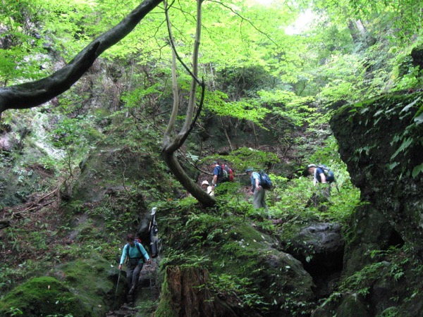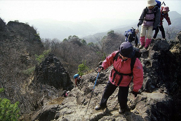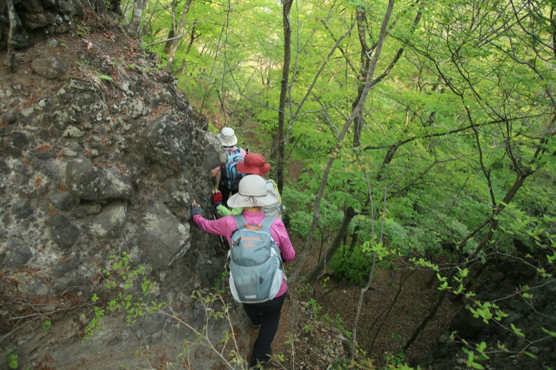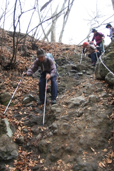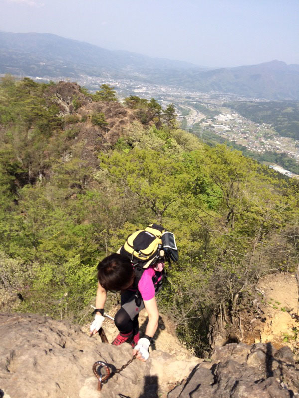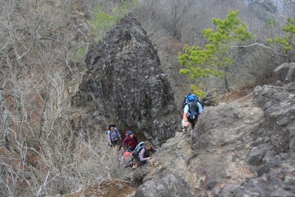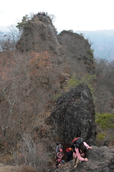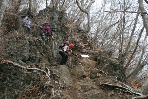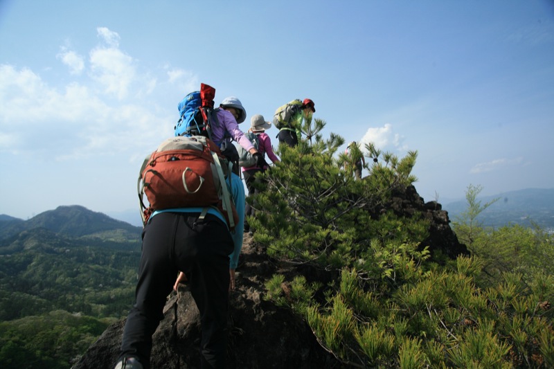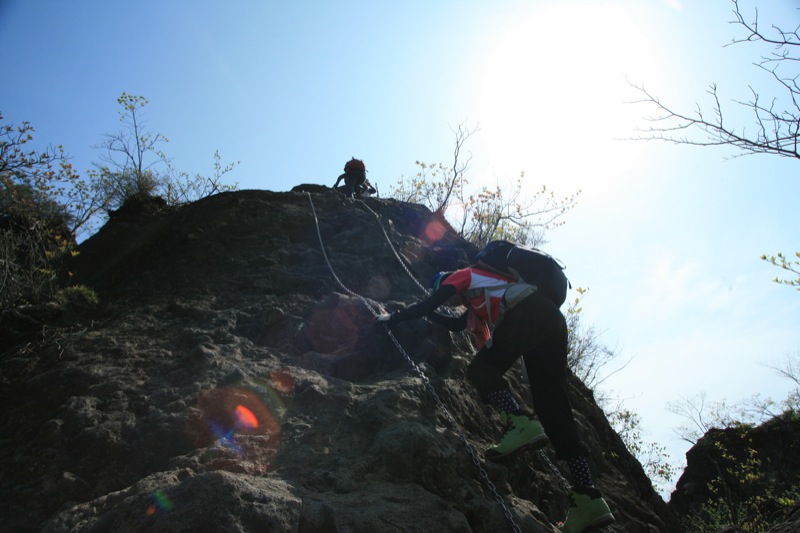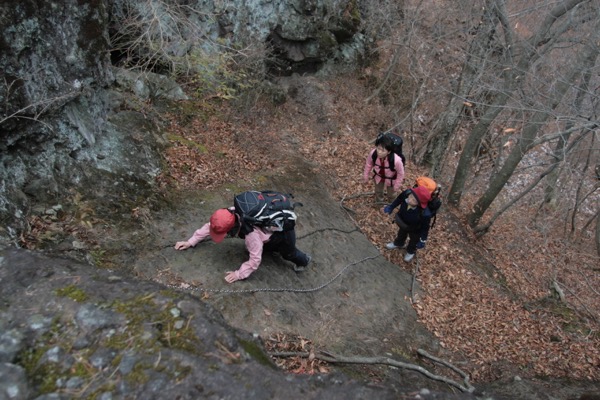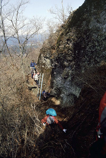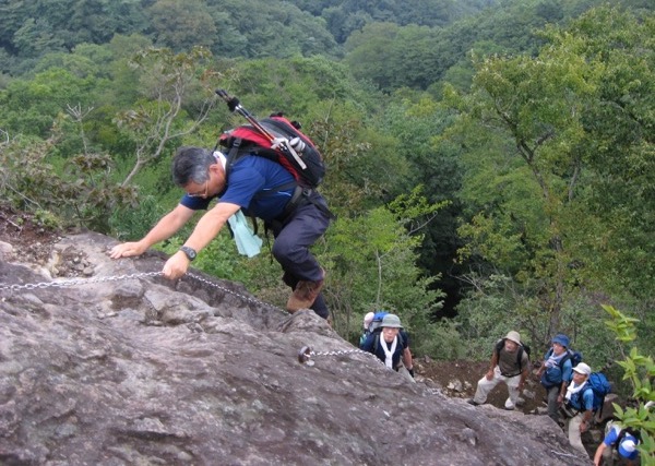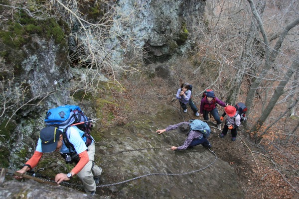 *じつは岩櫃山には危険度の高い岩場が何か所かあって、クサリ場となっています。そのクサリが、かなり力量のある人によって設置されたと感じるほど、適切なのです。岩場の歩き方を知って利用すれば、ものすごく安全な山だと感じます。ですから私は比較的初歩の人たちに岩場の歩き方を体験してもらうためにこの山を選んできました。スリルがあるけれど危険は少ないという点で秀逸でした。