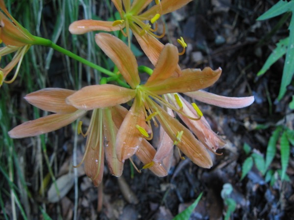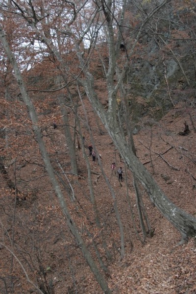 そうしたら、登り始めに(あとで、そこがキツネノカミソリの群落だと知るのですが)小石が1個私たちめがけて投げられました。ふと見上げると頭上遥かな岩場にカモシカが立っていました。【97】の写真で私たちはほとんど同じ高さまで登っていますが、そのときまでずっと彼はその場所で私たちを見下ろしていたのです。