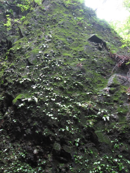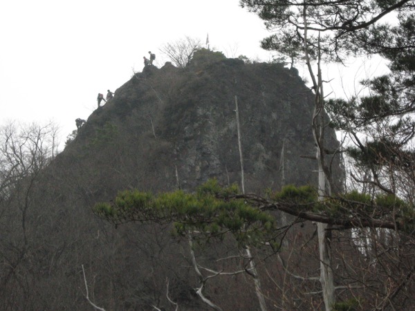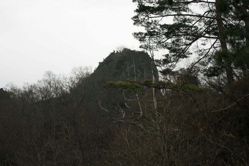 岩山の一番高く見える岩峰が山頂ですが、その部分はここに見える岩肌を左から右へと回り込んで、向こう側から登ります。