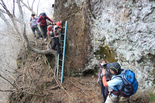 *こういうクサリ場は日本の山にはほとんど無数に存在します。ではどうするのか? というと、安全を確保するためにはハシゴにしてしまいます。槍ヶ岳の表銀座ルートは、ハシゴによって一般ルートになっています。岩櫃山は現在あるクサリによって一般ルートになっているのですが、これを「観光ルート」にするならハシゴをかけるしかありません。はっきり言って、岩場の歩き方の「三点支持」を知らずにクサリ場に突入すると、いつ、なにが、起こるかわかりません。そういうスリルを満喫できる山として今のまま残すなら、あくまでも登山ルートに。観光客は排除しなければいけません。