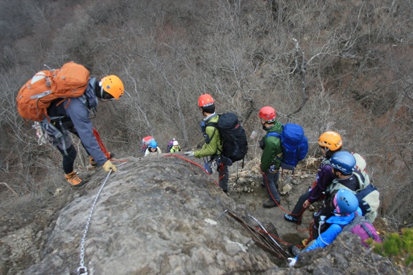 クサリ場通過の体験として、(1)クサリに頼らずに「三点支持」で登る。(2)ハンドホールドがとれなければ、クサリを支点として利用する。(3)パニックになったらクサリの要所に用意したロープの輪を握ることで、指示を待つ。……という仕掛けをしました。