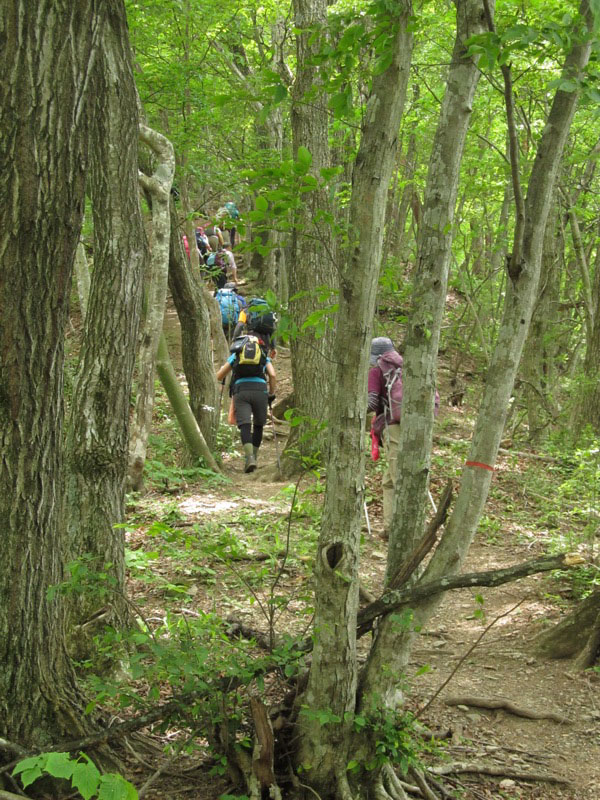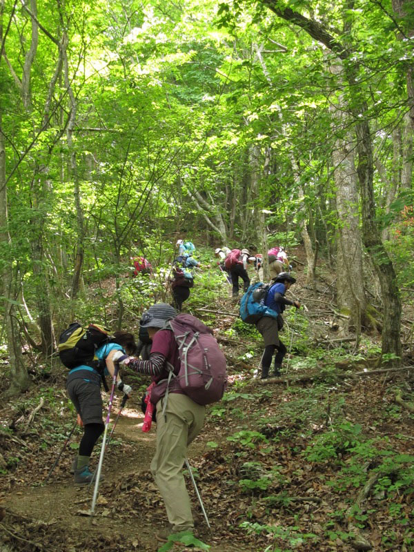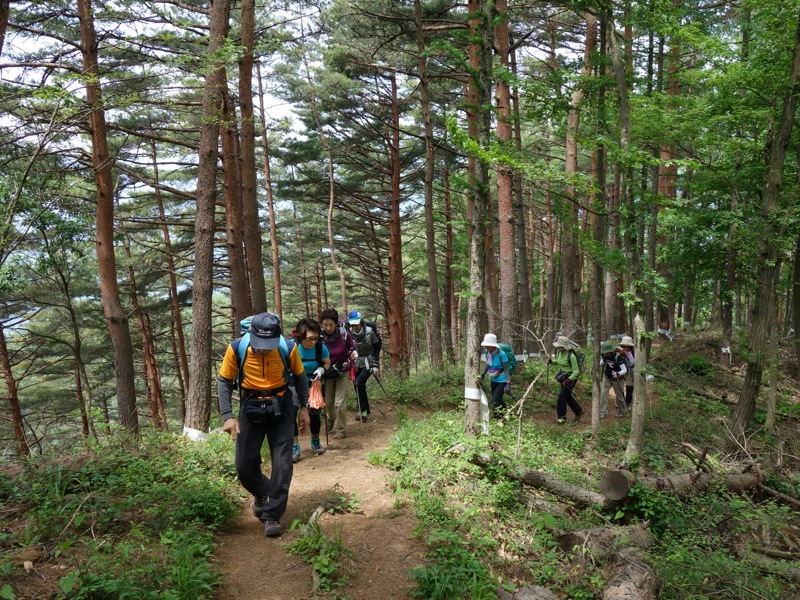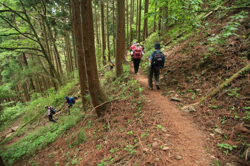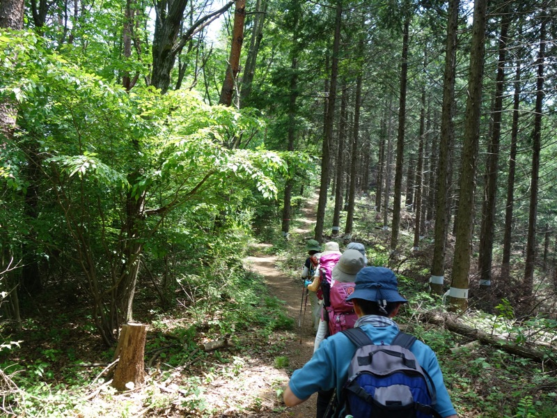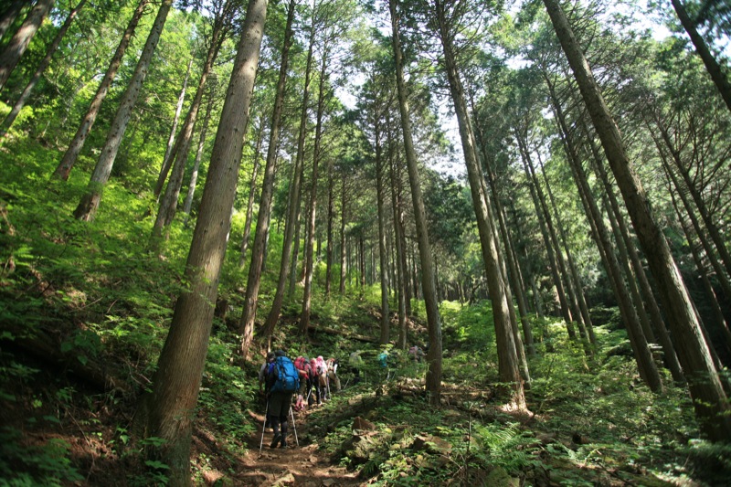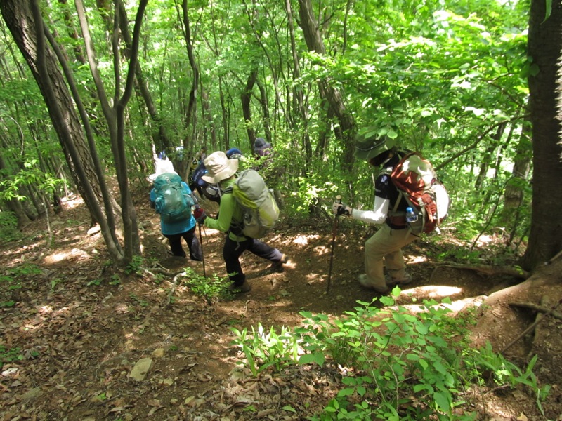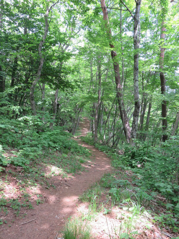 気持ちのいい下りが始まりました。小走りで下れそうなゆるやかな傾斜で、足元がしっかりしている道が一番スピードが上がります。しかし下りの大原則である「つま先着地」(これを常識的と考えられない人が多いのですが)を堅持しないと一発でヒザをやられます。初心者を連れて登山するベテランが下りでいつものスピードを出すと、歩き方を知らない初心者は一発でヒザを痛めてしまいます。私は大学時代の登山合宿で何度も新人が足を痛める現場を見ています。下りでは「走れ!」が伝統的でしたから。