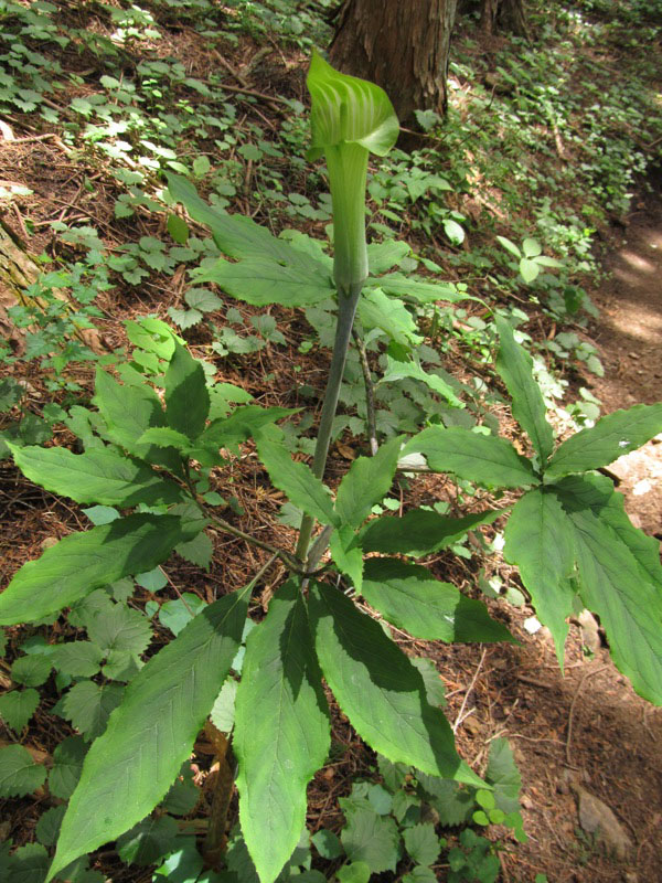 これはなんでしょうね。マムシグサでなければ、ナンチャラカンチャラテンナンショウというのでしょうが、仏炎苞がうす緑色で、そこに白い筋が入っていればマムシグサでいいのではないかと思います。