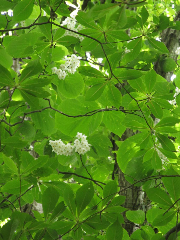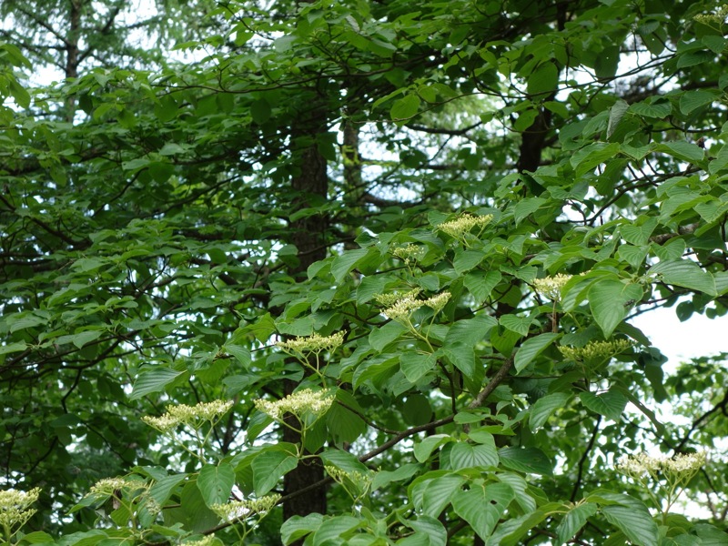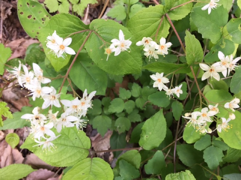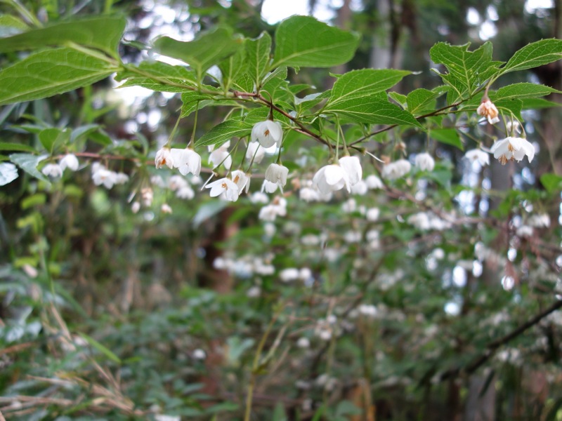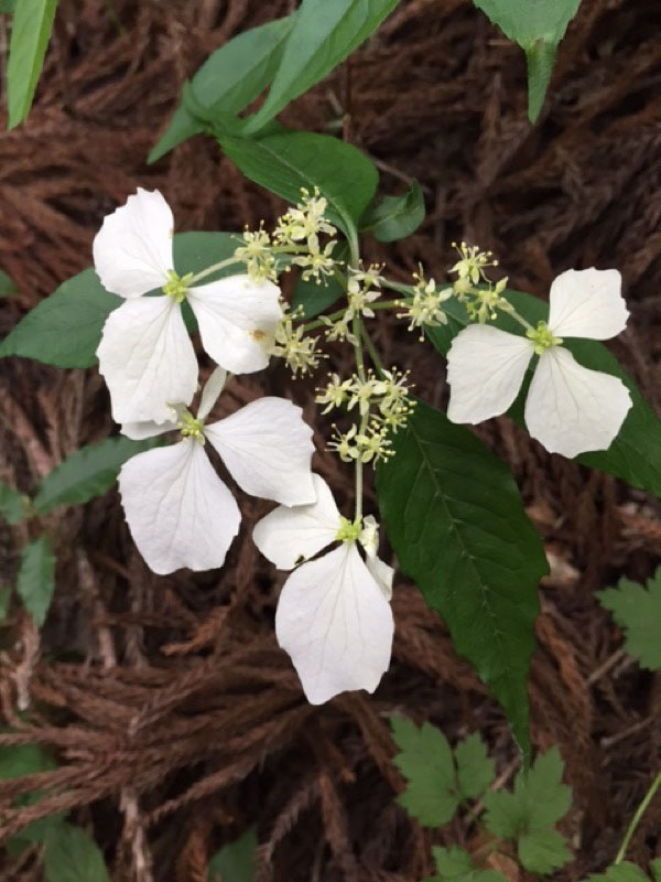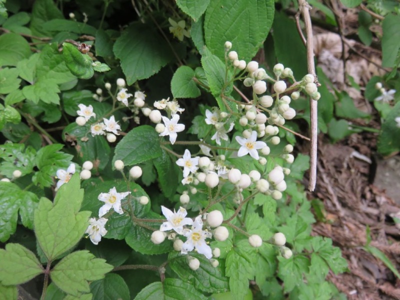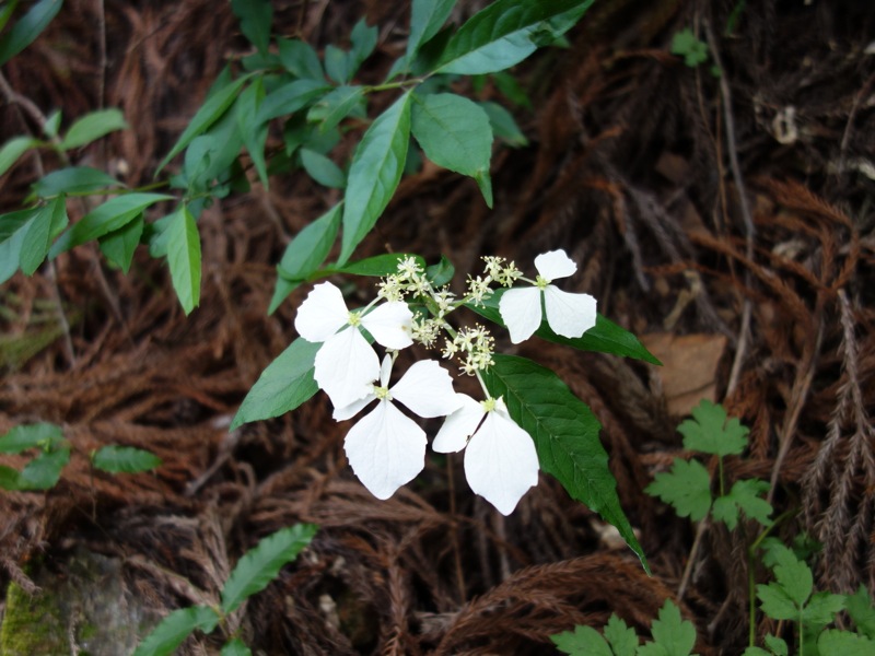 花が少ない中、際立った白、ガクウツギ。装飾花のガク3枚がひらひらと垂れる。花にはよい香りがあるという。葉は深い緑で青みがかり別名「紺照木」こんてりぎ。