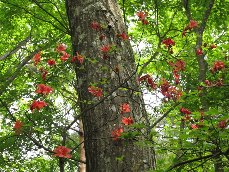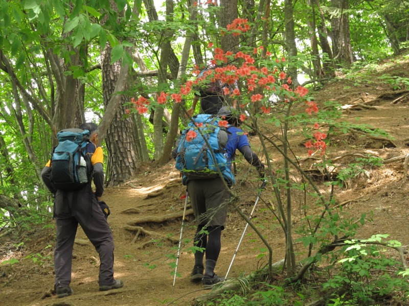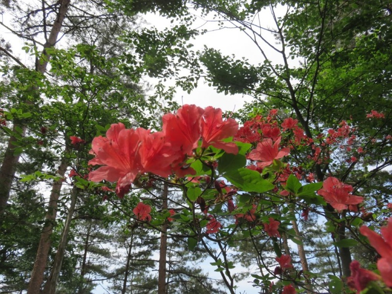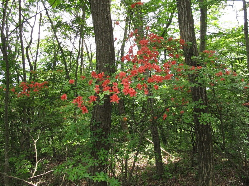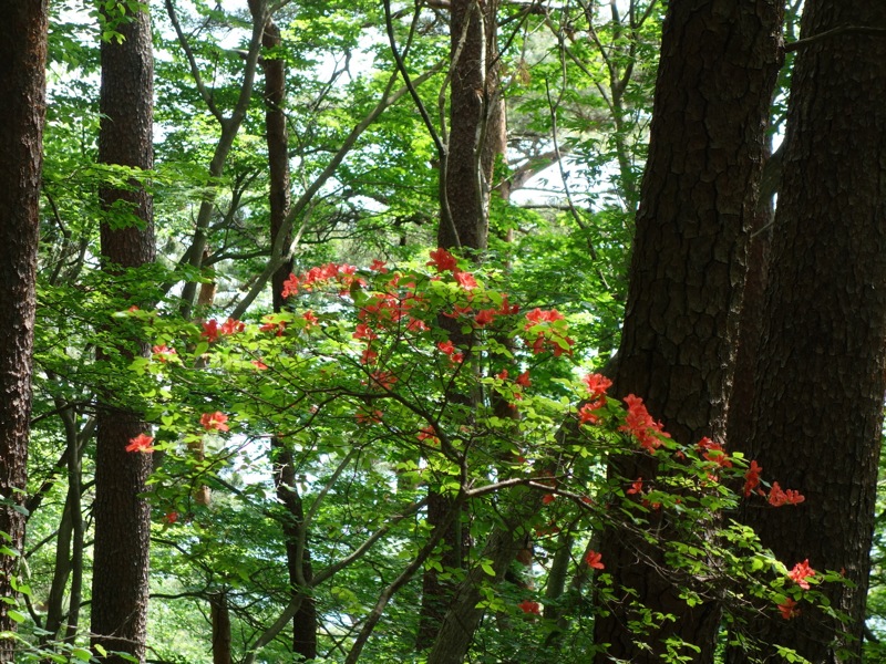 いたるところ緑、緑、緑。新緑の山の中で 一際 目立った存在を見せていたツツジ。赤い花が鮮やかだった。