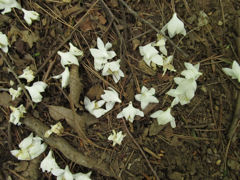 蜘蛛らしき虫がいたから撮ったのではありません。……もっともクモは節足動物で昆虫ではありません、が。……じつはこれ、フタリシズカです。白い小さな花をつけた花穂を2本か3本伸ばすというけれど、4本や5本もあります。1本だとヒトリシズカですが、それ以外の部分はよく似ているのに、貴族と庶民というほど印象が違うのはどうしてでしょう。どちらがどちら? は一目でわかります。とくに幼小のころは。