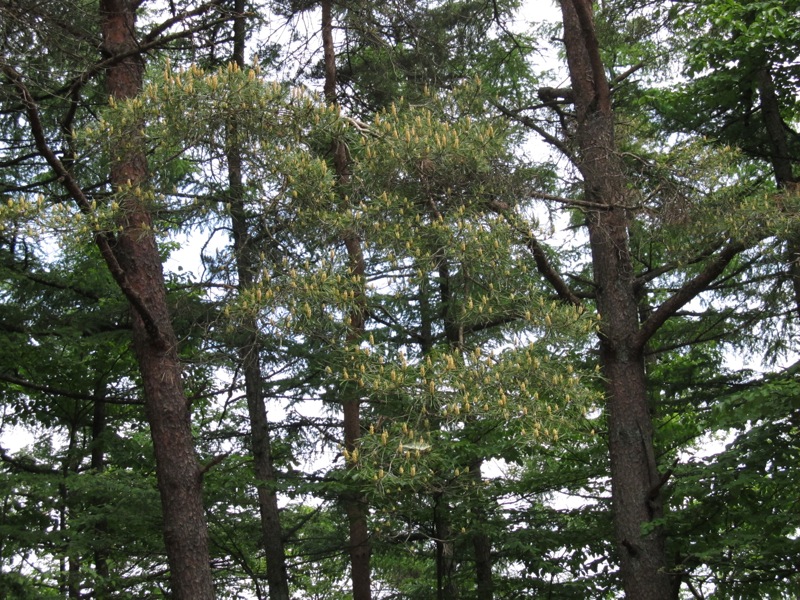 アカマツの林に入ると、不思議なハチマキ。シカの食害を防ぐ新しい試みと想像しましたが、単に植林上の目印かも知れません。かつて光岳の山腹で、簡単なシカ除けを見たことがあります。それはスギの成木の、人の身長ぐらいの高さまでに4か所、赤いロープを巻いただけのものでしたが、食害を実力阻止するのではなくて、なんとなくいやな感じを与えて防ごうとするもの。でも「シカは想像以上に賢い」というのは中禅寺湖の千手ヶ浜にクリンソウの花園を造った伊藤さんの話で、毒草であるクリンソウもシカは食べ方を学習するし、戦場ヶ原の鹿柵にしても、ほんの一か所破れがあれば、群れの全体がそれを利用して自由に行き来するということでした。この白いハチマキ、想像はまったくの見当外れかも知れませんが。