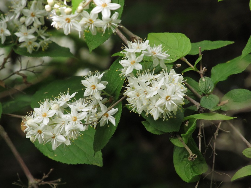 マルバウツギ、だと思います。ウツギより花のかたまりぐあいが小さいかな、というのと、そういわれれば葉っぱが丸いかな、というところ。でも写真を見ているうちに、葉の付け根の枝との出入り状況がちょっと複雑な感じがしました。調べてみると葉はウツギと比べると広幅なので丸みを感じるという意味のようです。それと「他の同属各種と異なり、花序の付け根の葉に柄を欠く」(『山の花1200』)とありました。