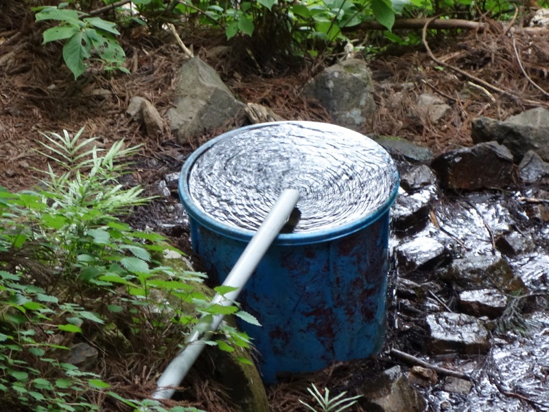 下山途中のポリバケツを置いただけの風情のない水場。でも、この写真、何故か捨て難い