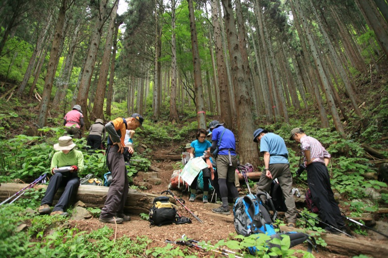 快適な下りでしたが、水場でひと息入れました。疲れている人がいると、下りの何でもないところでつまらない事故が起きたりします。下山路での休憩は単純に休むためというより、そういう兆候を観察したり、グループ全体の気分をリセットするためにものすごく重要です。ここで頭を働かせる人がいれば、余力有りとして安心度は高まります。