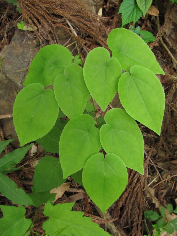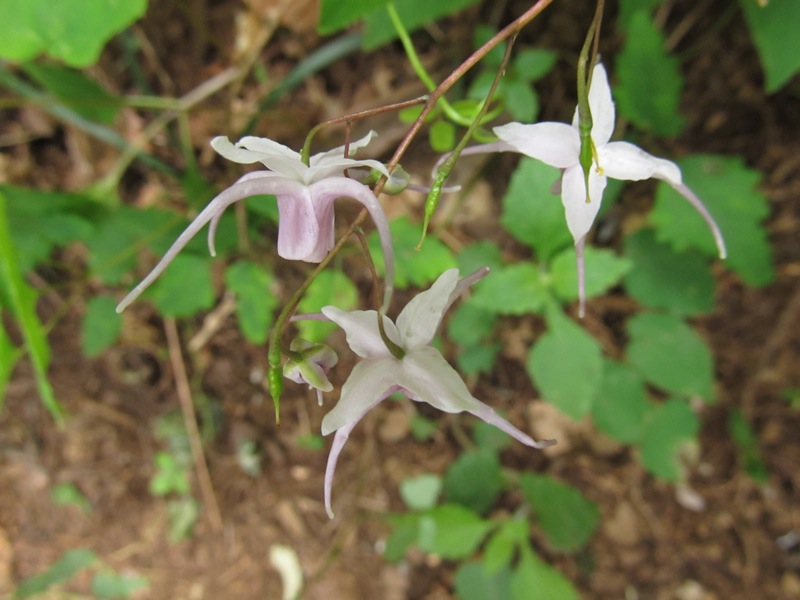 イカリソウ……でいいようです。花の色は赤紫が基本で、白やピンク、黄色までが野生種で見られるとか。これはピンクでしょうか。