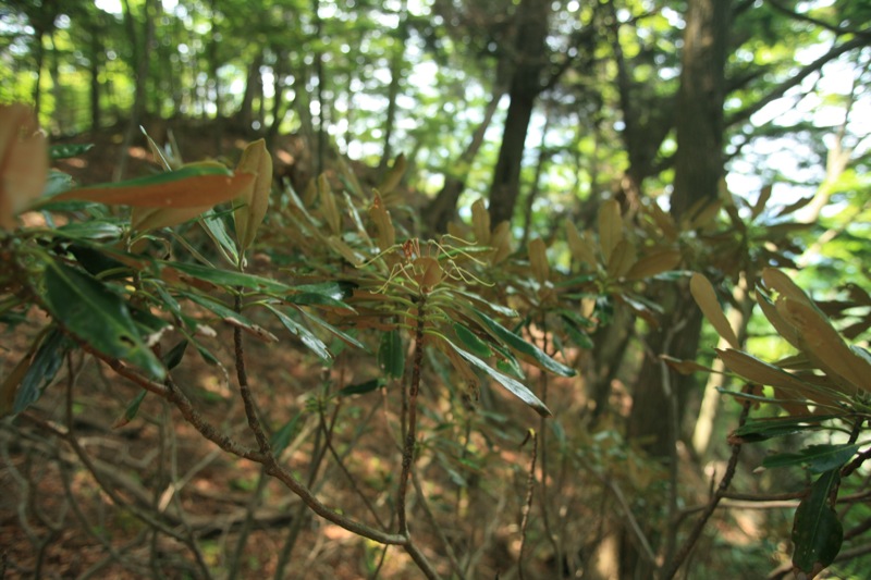 稜線に出たところでいつも休憩するのですが、そこにアズマシャクナゲがあります。花が落ちた花がらがありましたが、花数は今年は少なかったようです。もとよりシャクナゲの時期には遅かったことがこれではっきりしました。……遅かったのです。