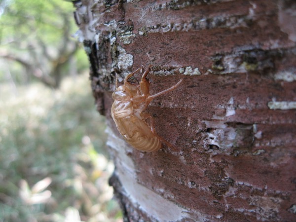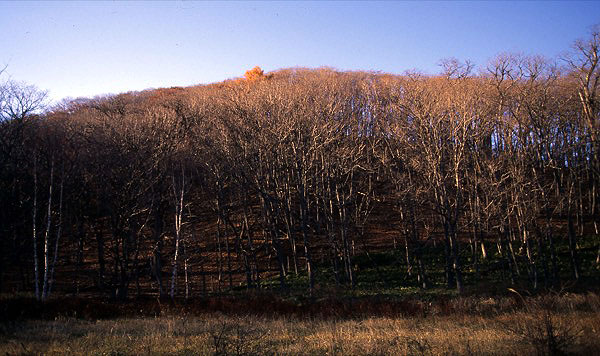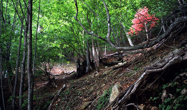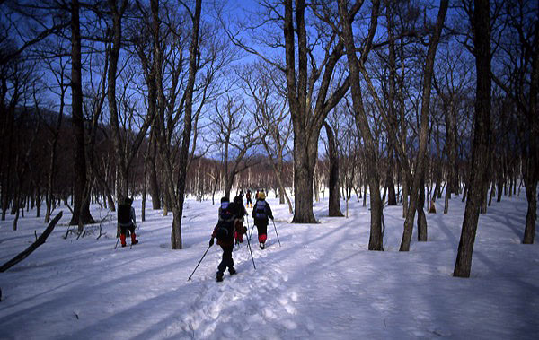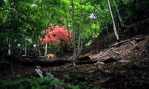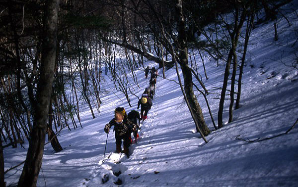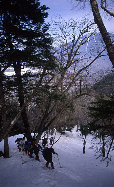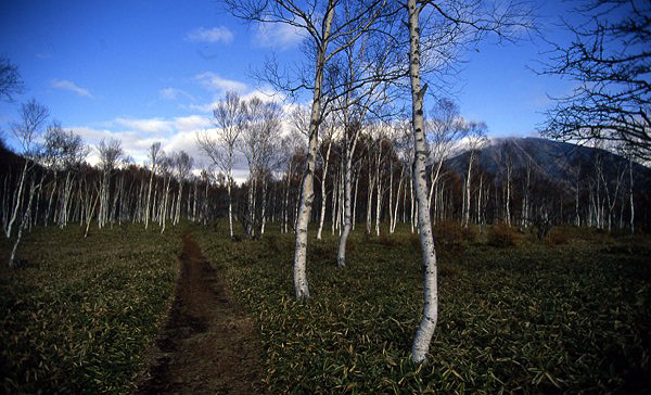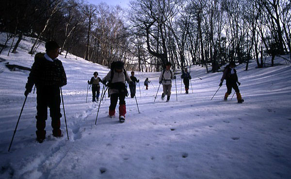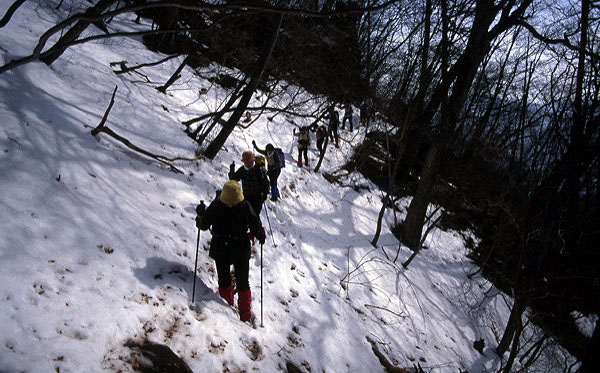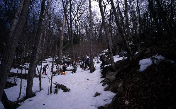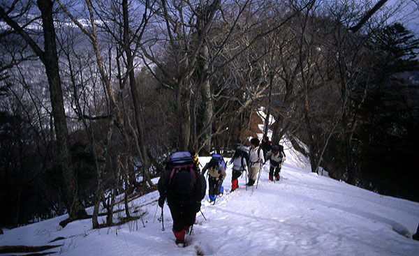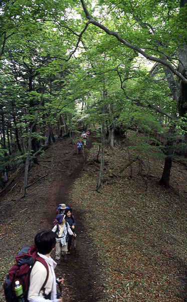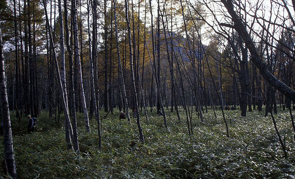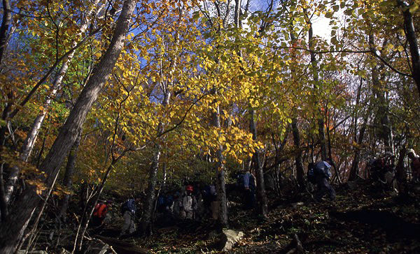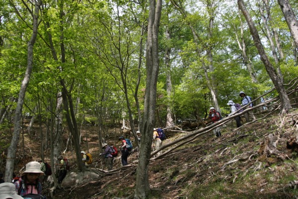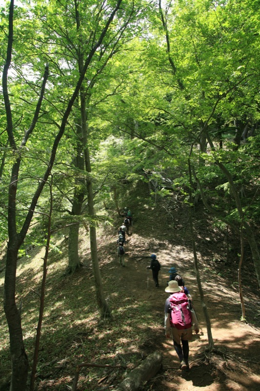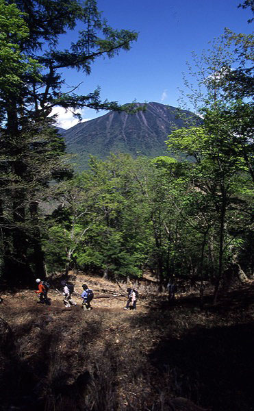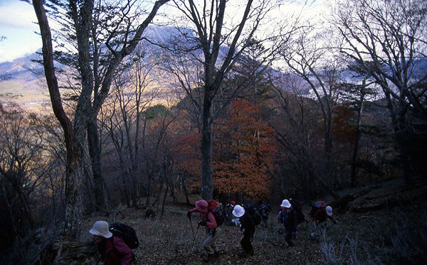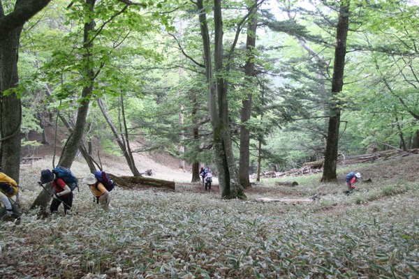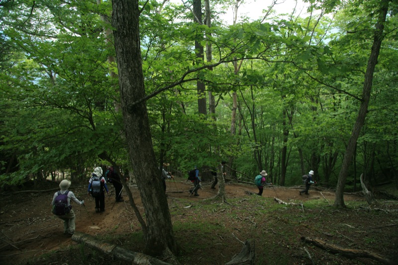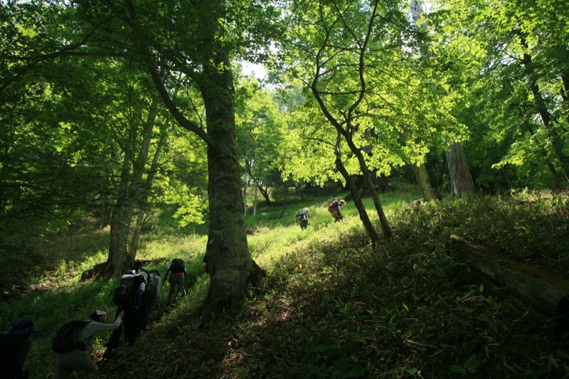 山すその平地は中禅寺湖の裏側にあたります。そこから高山の稜線に向かってゆるゆると登り始めます。以前、このあたりで、道の向こうに熊を見つけました。列を静止させ「熊がいる!」と後ろに伝えると、最後の人も、尻を向けてゆっくりと去っていく姿は見ることができました。