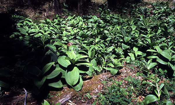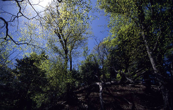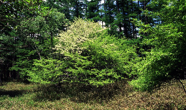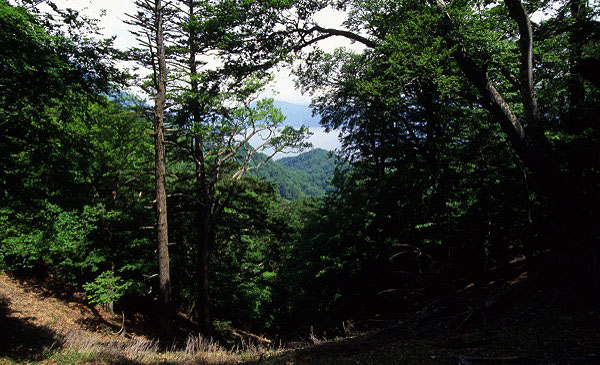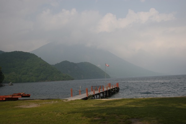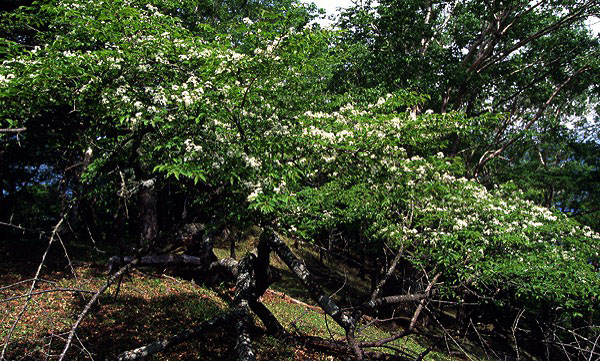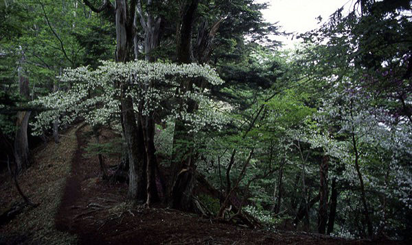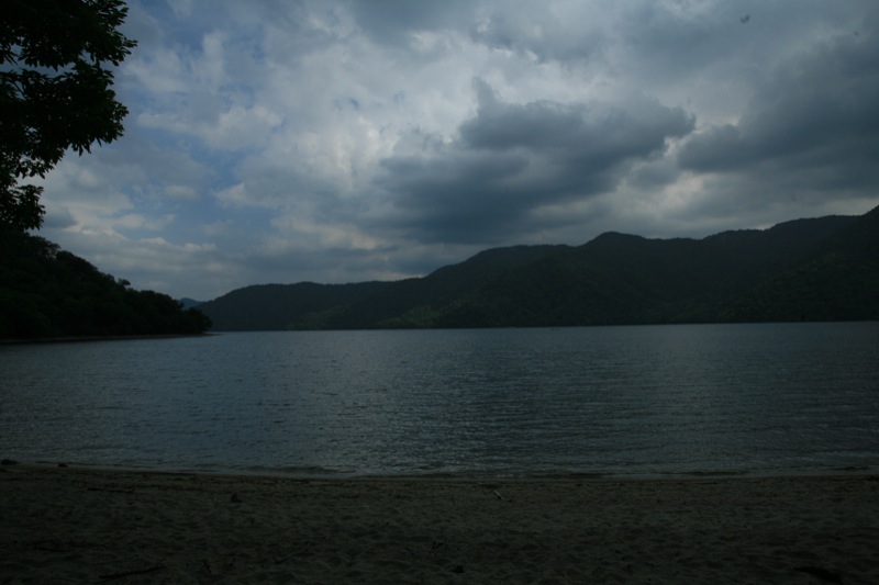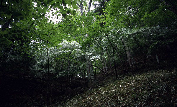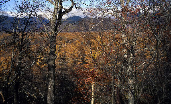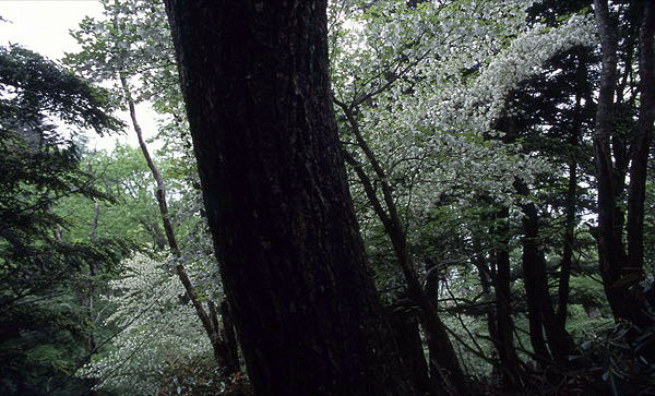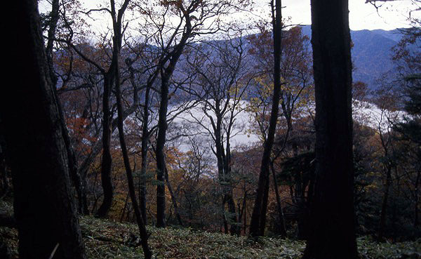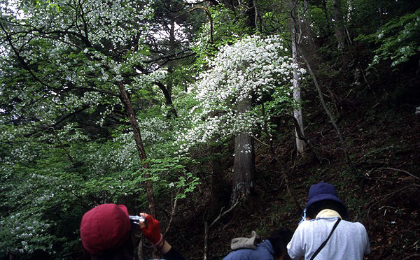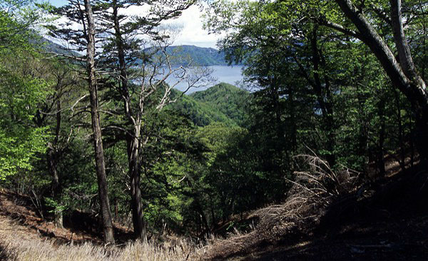 初めて中禅寺湖の湖面がくっきりと見えました。じつは中善寺湖畔の道をバスで来る途中、対岸の山肌に白いかたまりがひとつも見えませんでした。それがシロヤシオですから、バスの中では絶望的な気分になっていたのです。湖面の向こうに、その斜面が見えています。黒檜岳から社山をて半月山にいたる稜線で、そこでは鹿の群れによって刈り込まれたササ原と点在するシロヤシオが独特の風景を見せてくれます。