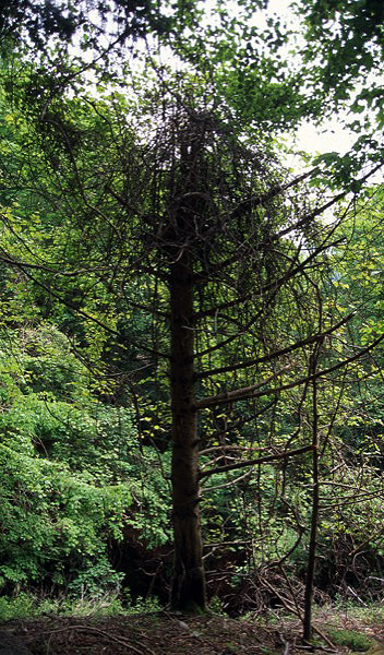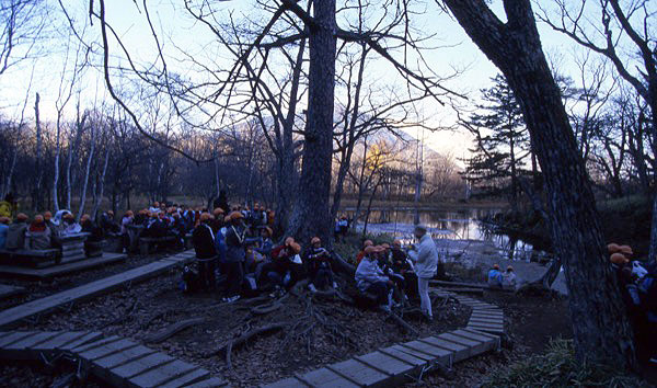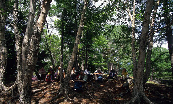 湯川です。湯ノ湖から湯滝を落ちると、戦場ヶ原を抜け出てきて、竜頭の滝から中禅寺湖へと流れ込んでいきます。ここでランチ休憩としました。このときは気づきませんでしたが、右から5人目の白い服の女性の向こうにある木立に異変がありました。