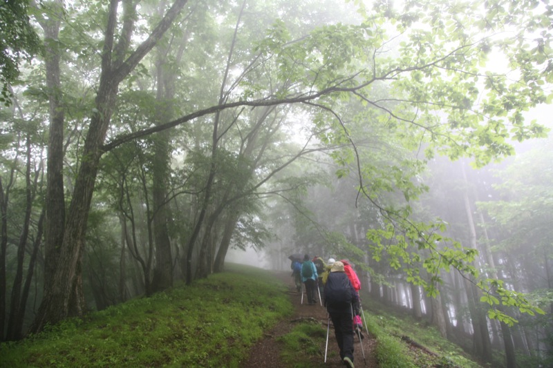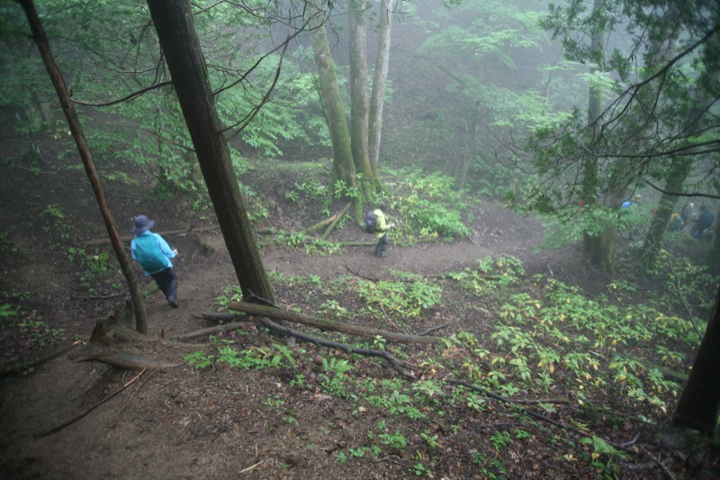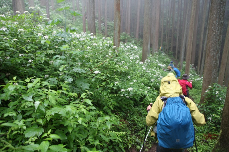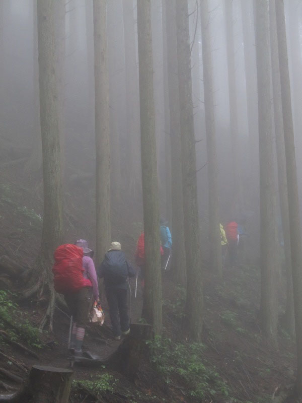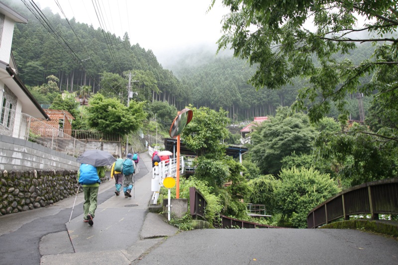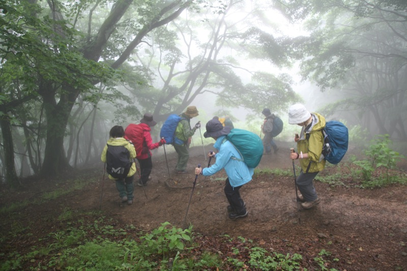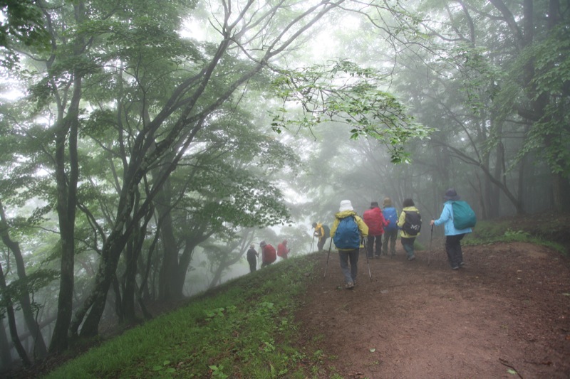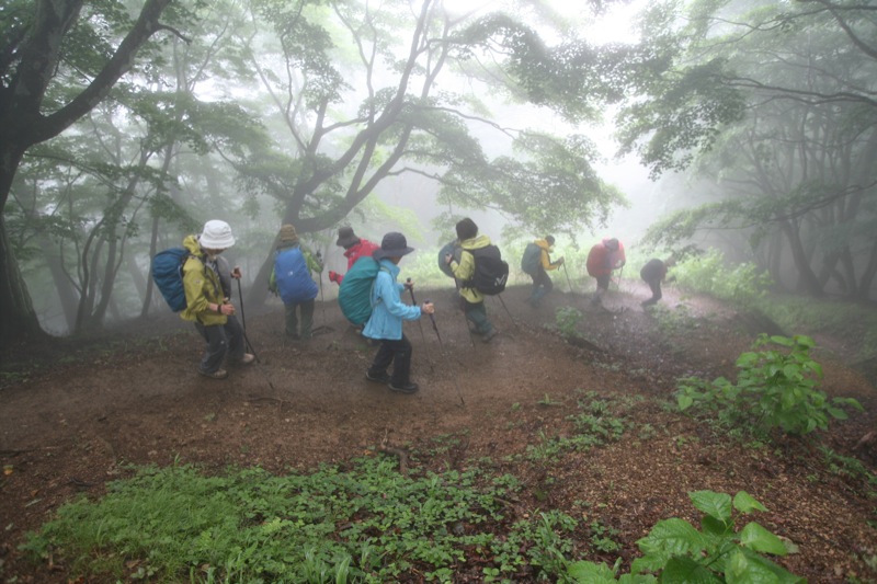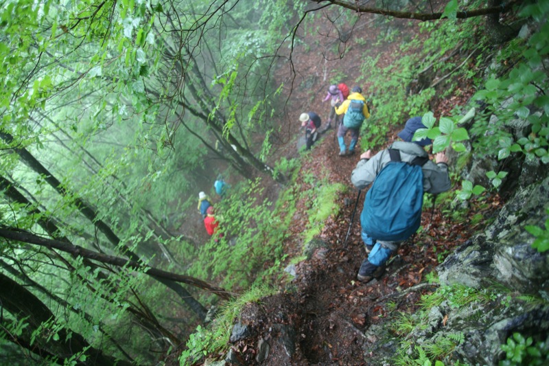 *この日の天気予報は最悪でした。雨に遭わない可能性は0%、つまり梅雨時に、雨具をつけたら外から濡れなくても内側からビッショリという最悪の状況が保証済みでした。私自身も家を出るとき憂鬱でしたから、参加者の皆さんはさぞや……と思っていたら、欠席はひとりも無し。最近、そういうことがしばしばあるので感心します。月に1〜2回の山歩きがその月の「健康」にかかわる重要性が、雨に遭う、遭わないよりも重要だとみなさん考えているのです。