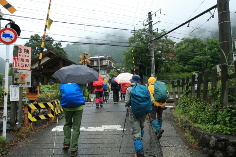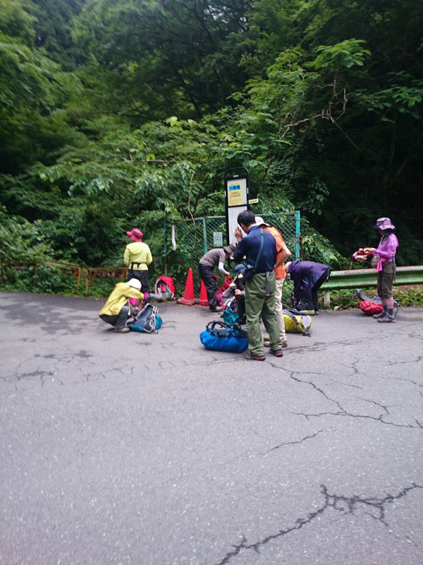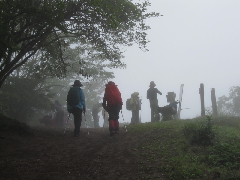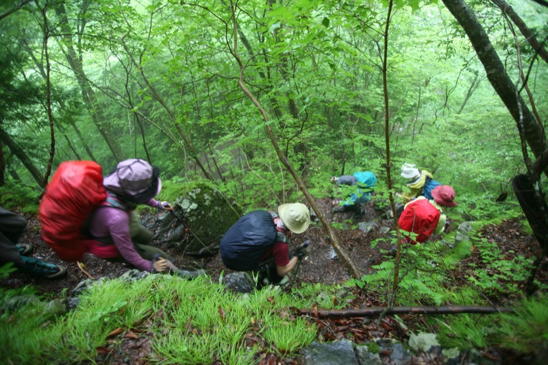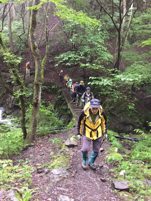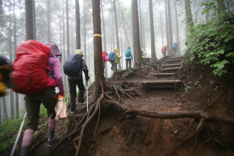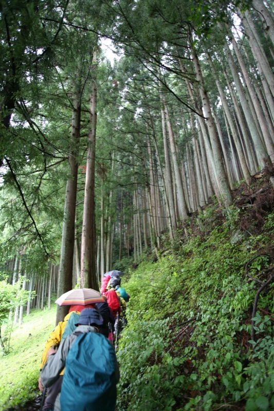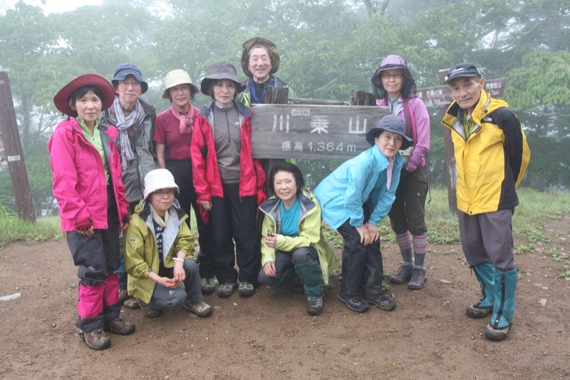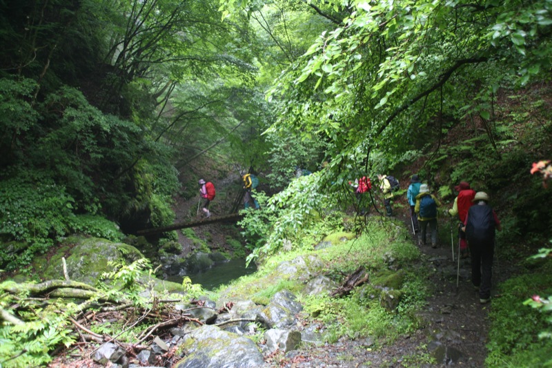 *この日の天気予報は最悪でした。雨に遭わない可能性は0%、つまり梅雨時に、雨具をつけたら外から濡れなくても内側からビッショリという最悪の状況が保証済みでした。私自身も家を出るとき憂鬱でしたから、参加者の皆さんはさぞや……と思っていたら、欠席はひとりも無し。最近、そういうことがしばしばあるので感心します。月に1〜2回の山歩きがその月の「健康」にかかわる重要性が、雨に遭う、遭わないよりも重要だとみなさん考えているのです。
