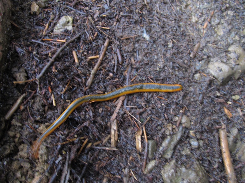 クガビルだと思います。ヤマビルのように人間の血を吸うことはないようですが、これが自分より大きなミミズを丸ごと飲み込んでいく光景は圧巻のようで、ネット上にたくさんの動画が配信されています。登山道ではときどき見かけるお馴染みさんです。