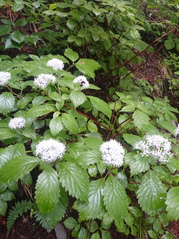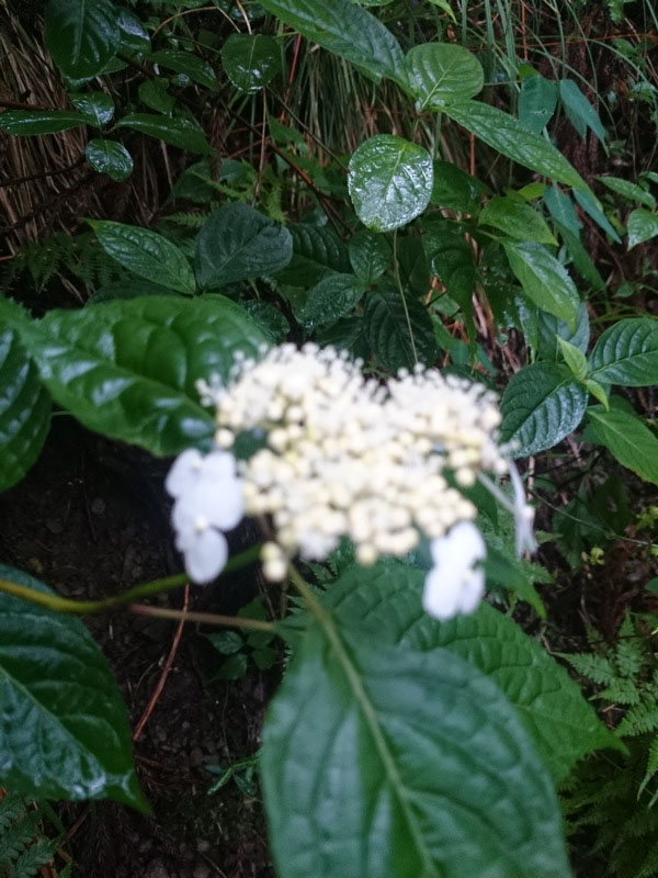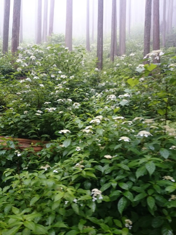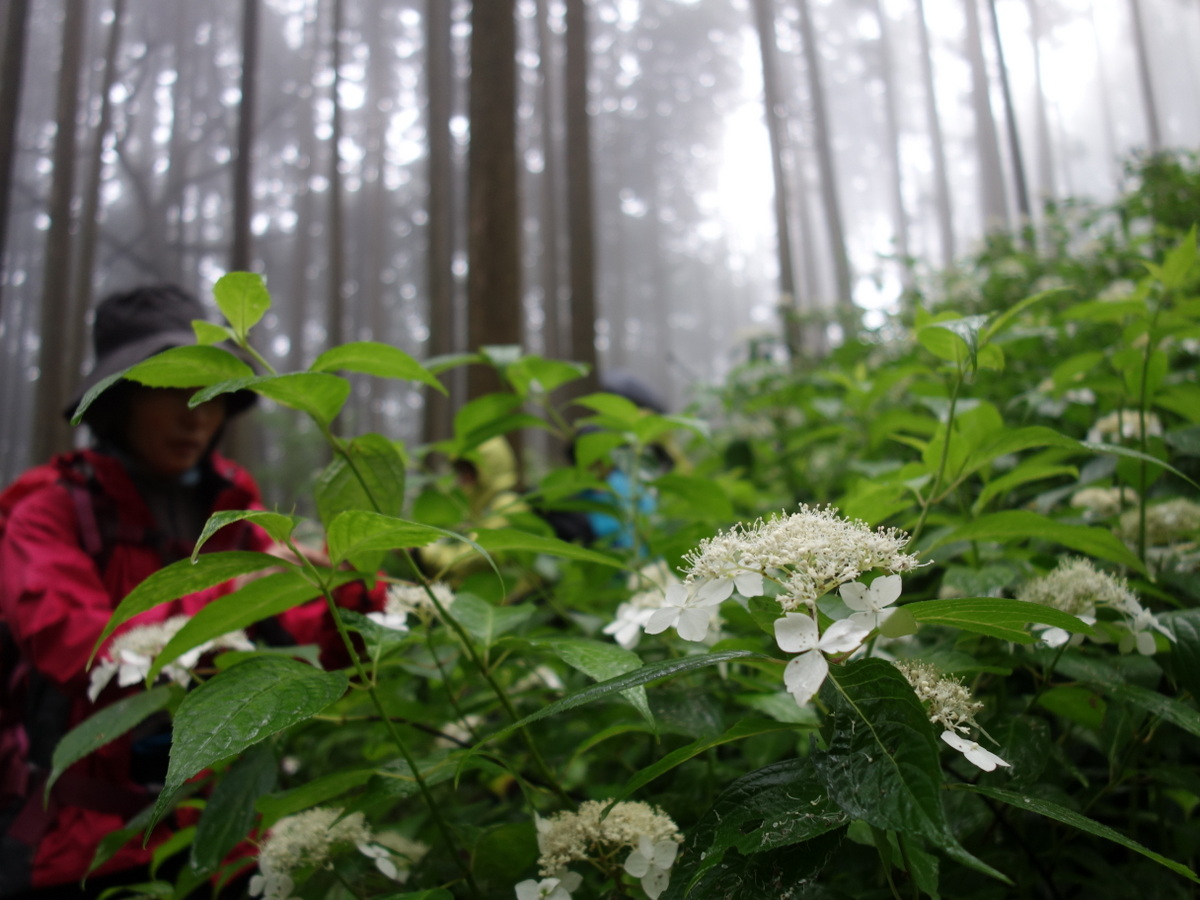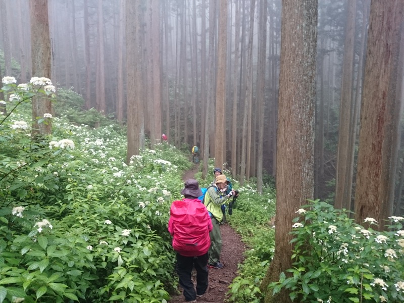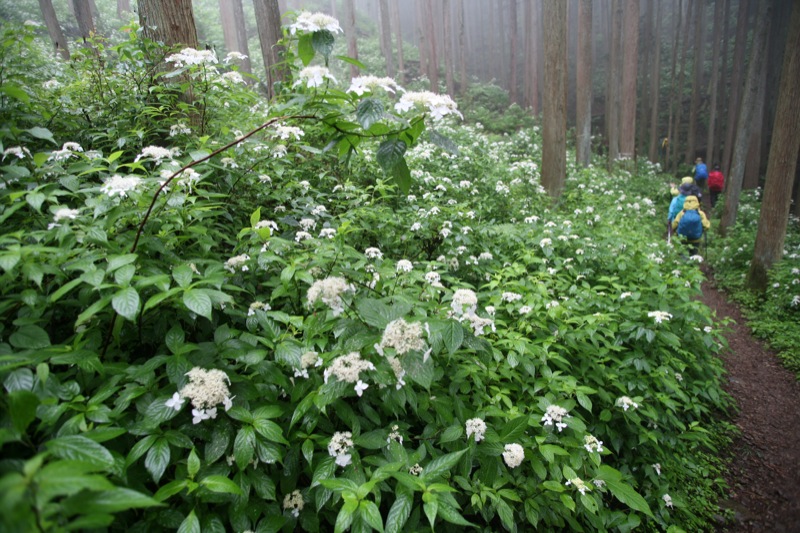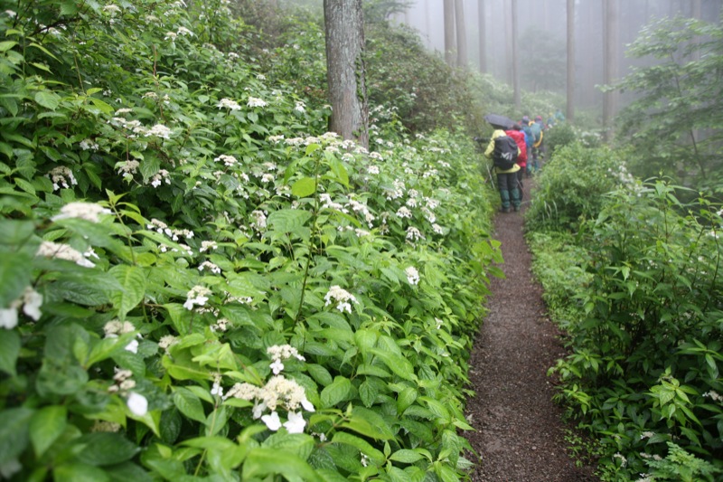 大根ノ山ノ神の先で林道と交差して、登山道は本仁田山方面と川苔山方面とに分かれます。川苔山へダイレクトに向かう道は標高約650mから750mへと高度差100mをおよそ1キロ半かけて登るという緩やかな道になります。そこで私たちはヤマアジサイに迎えられたのです。