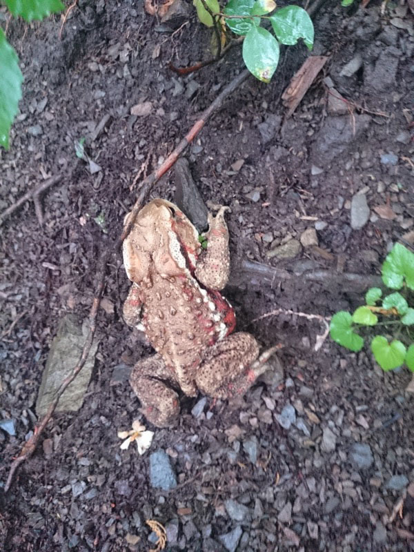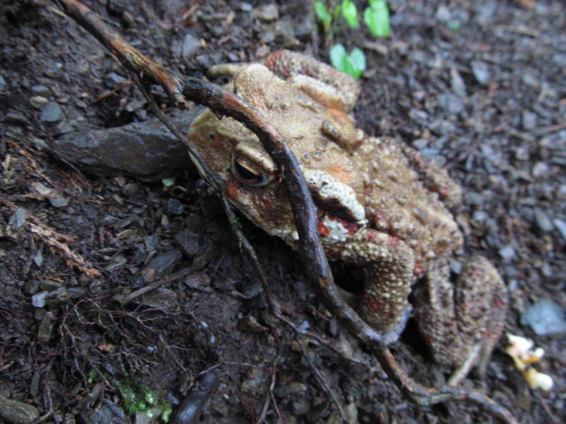 これはニホンヒキガエルと列島を二分しているアズマヒキガエル。ガマガエル、イボガエル、もちろん四六のガマなど、すべてこれの異名とか。短期間のオタマジャクシ時代以外は水が無くても生活できるそうで、10歳になる長寿ガエルもいるとか。ほかのカエルのように慌てて逃げないのは、外的から身を守る毒液を耳腺や皮膚、イボから出すことができるので鷹揚に構えているとか。