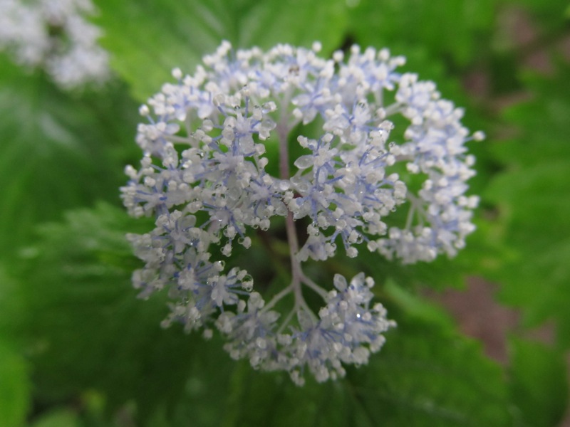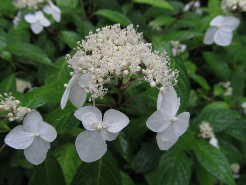 ヤマアジサイ(ユキノシタ科)。しかしながら、正直に言うと、「ヤマアジサイ」の定義がよく分からない。かつて稲村ヶ崎の丘の上の自宅の庭で各地から集めてきたヤマアジサイを栽培して一般に公開していたお宅に見せてもらいに伺ったことがあるが、多彩な色や形は目をみはるばかりだった。