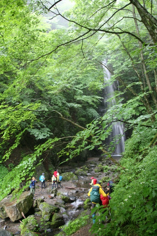轟きに目をやると、白いしぶきが眩しい小滝。近寄れない分、気持ちがひかれた。