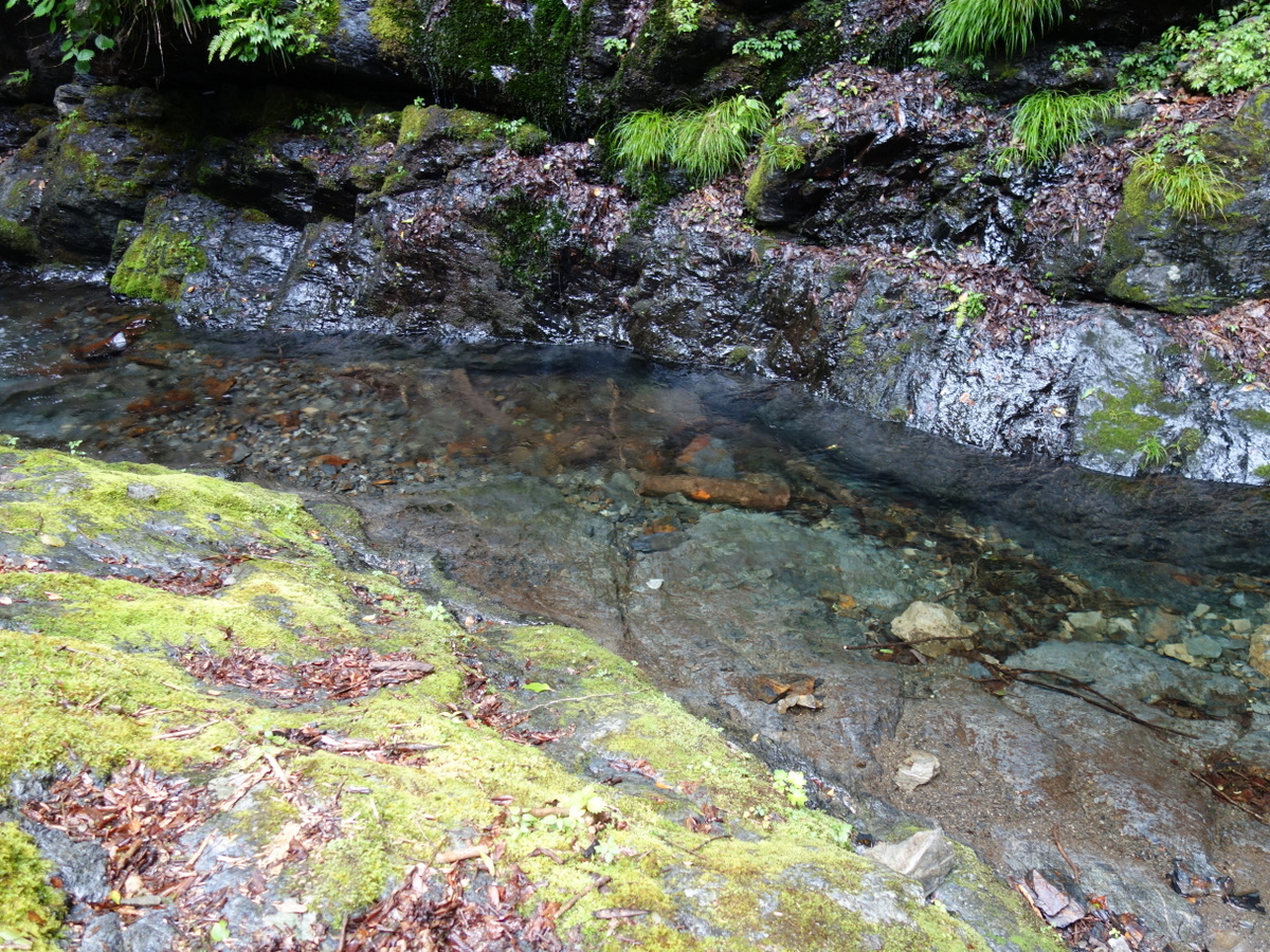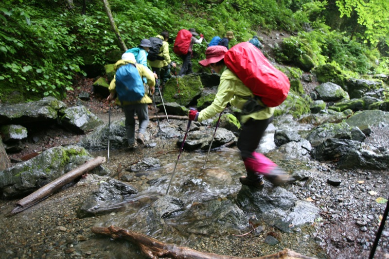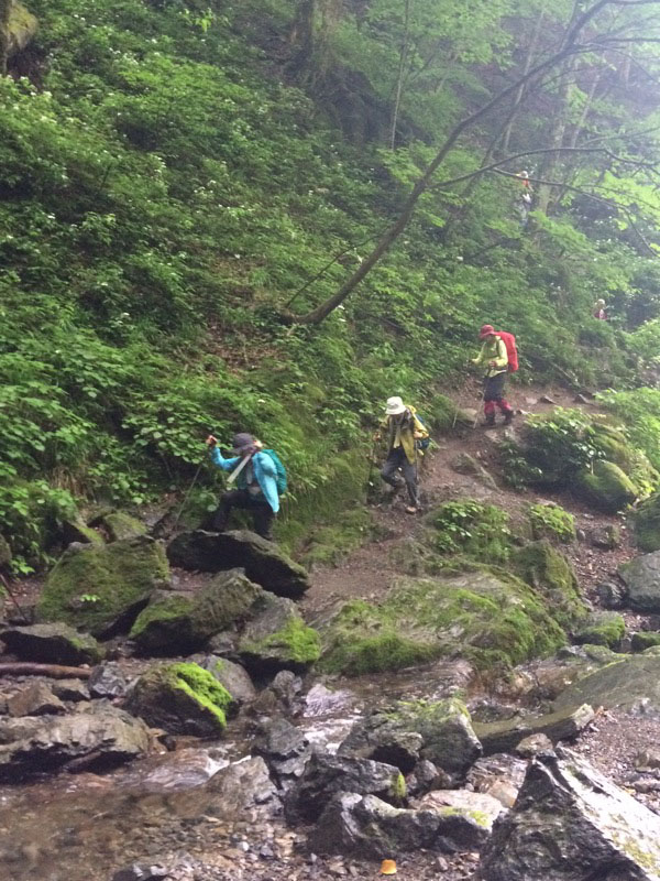 周囲はガスがかかってぼんやりとした景色にもかかわらず、川乗谷の澄んだ水の色が印象的だった。