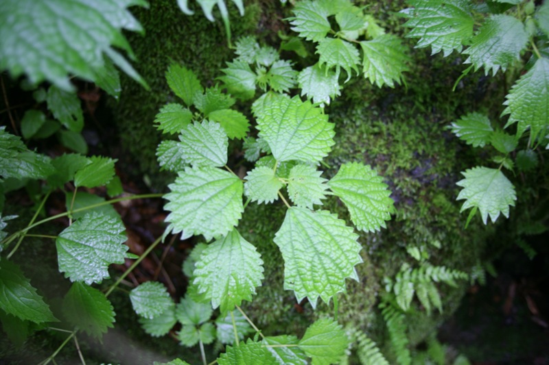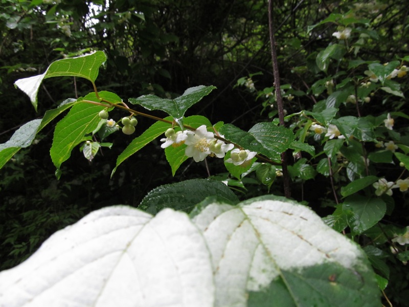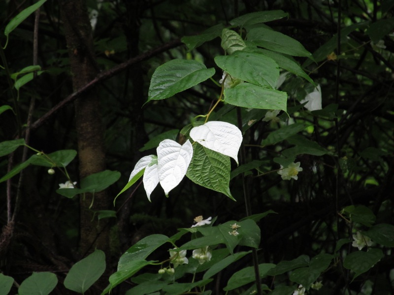 細倉橋のところで舗装された林道に出ました。そこにこれがあったのです。わたしは「ハンゲショウ」などと叫んでいたのですが、まったくのデタラメ。ごくあたりまえのマタタビでした。