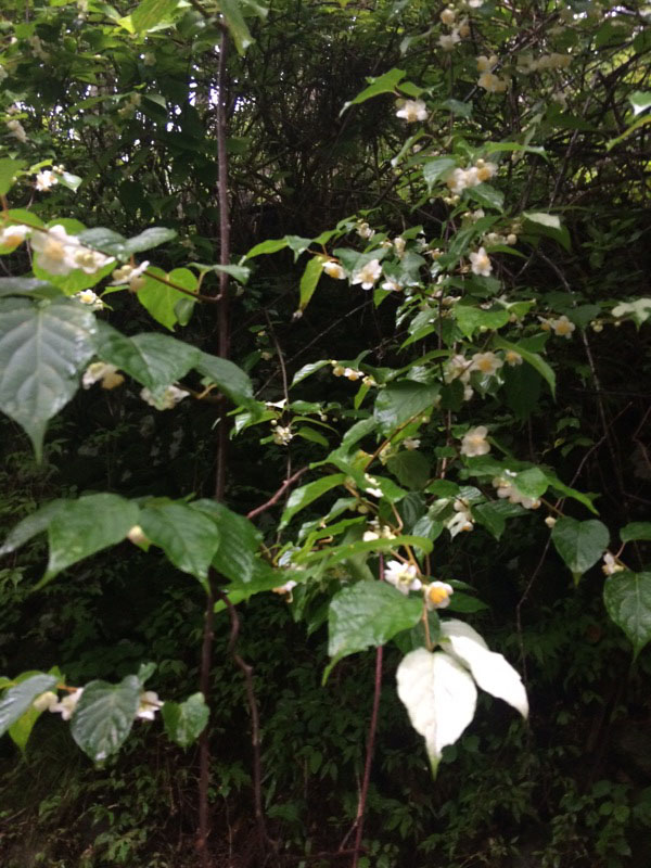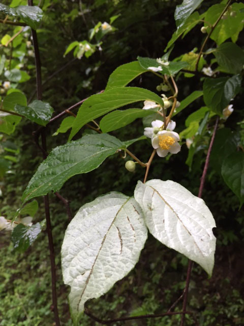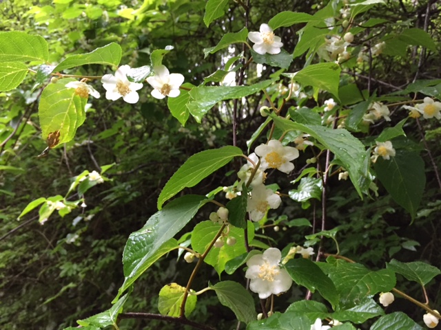 マタタビの花。白く清楚。知らなかった。白梅の花に似ているので夏梅とも呼ぶそうです。