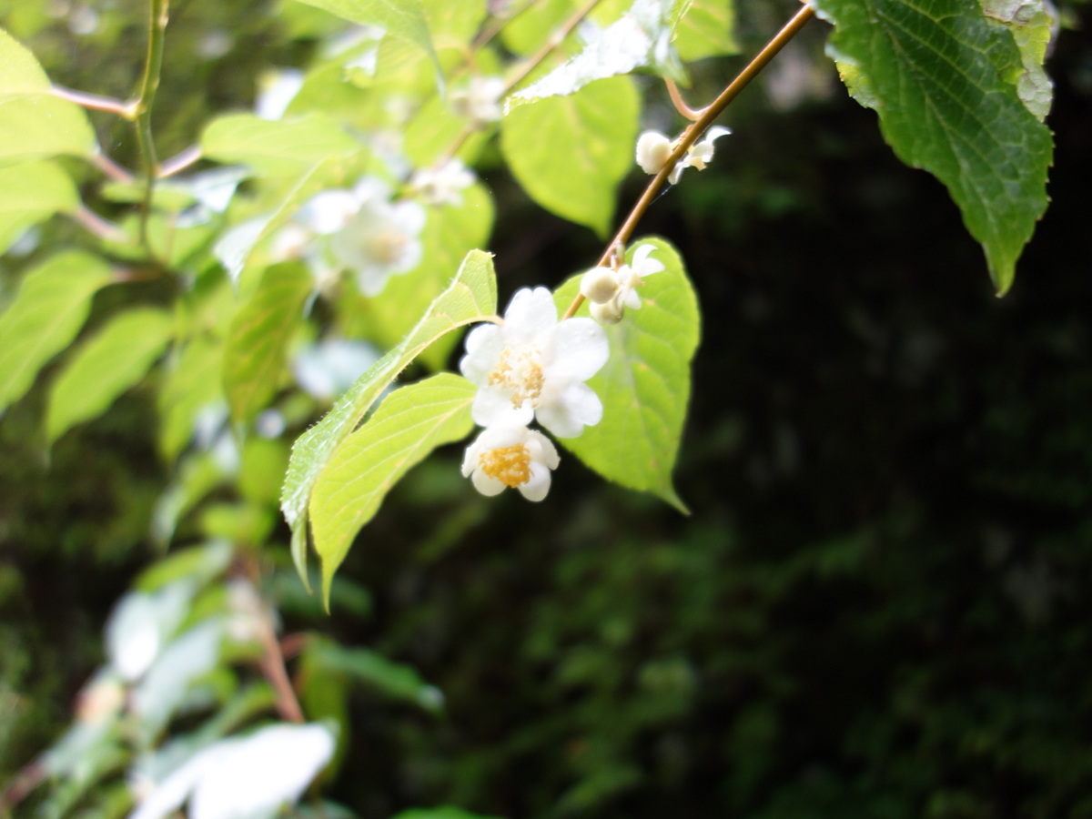 マタタビ(木天蓼、マタタビ科)の花。最近、なぜかマタタビをよく見かけるが、花を見たのは初めて。猫にマタタビというがマタタビには独特の臭気があるらしい。今度嗅いでみようかと思う。