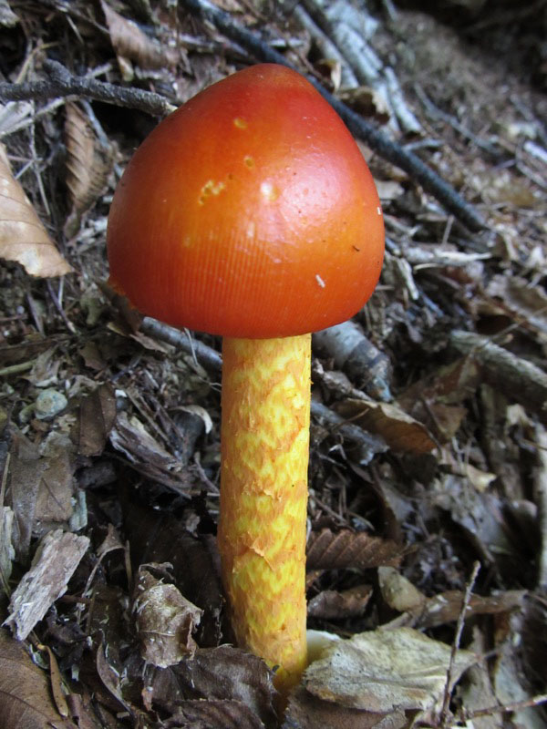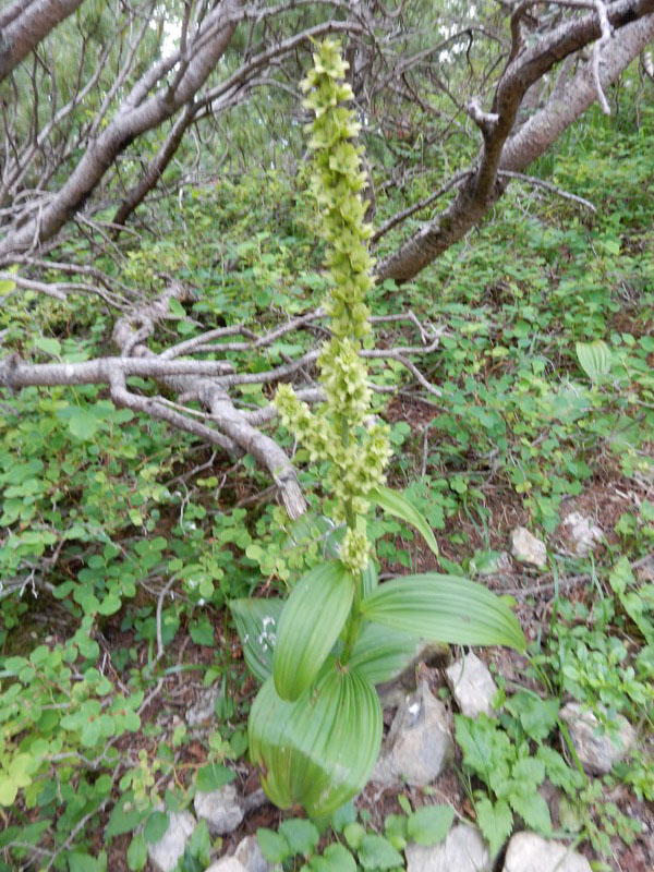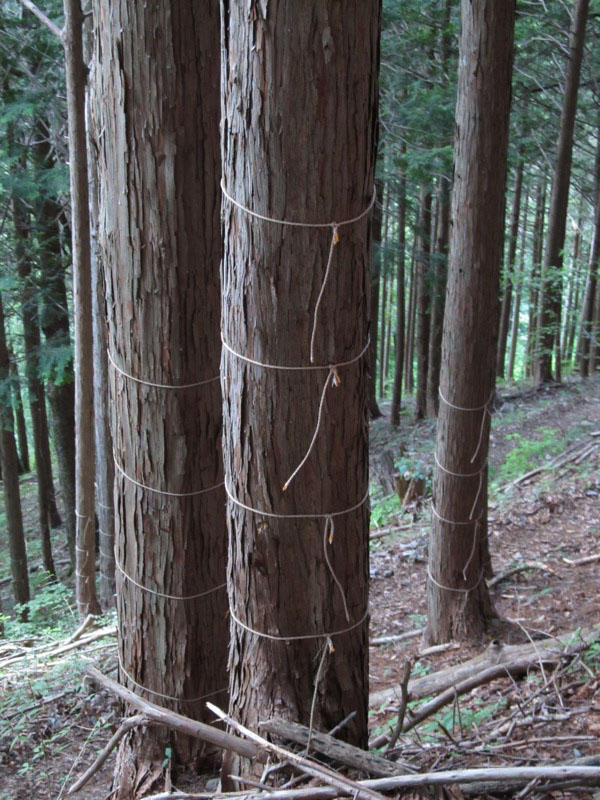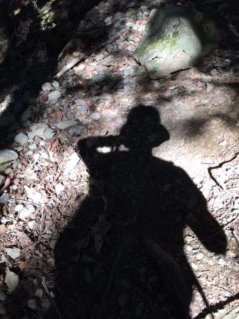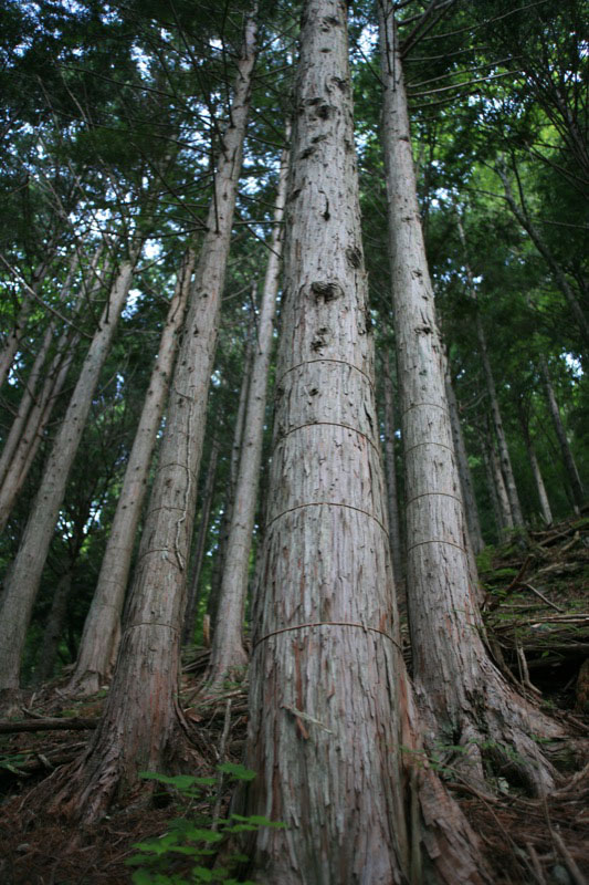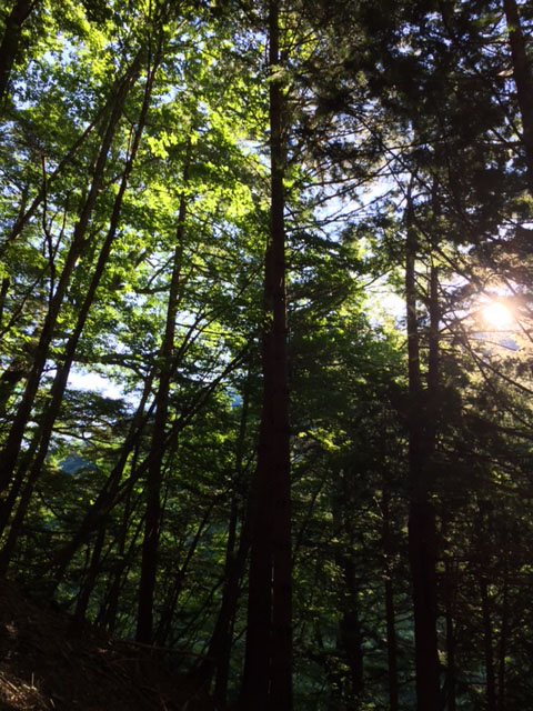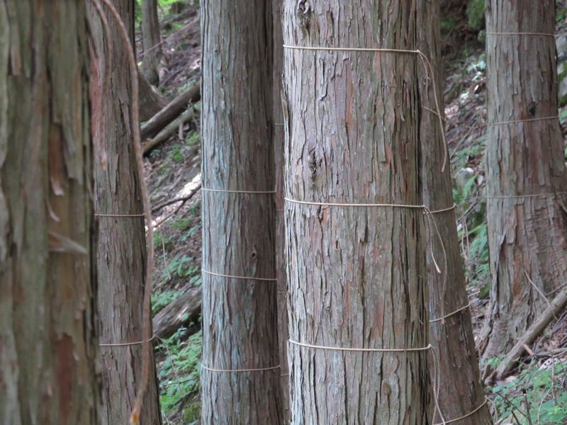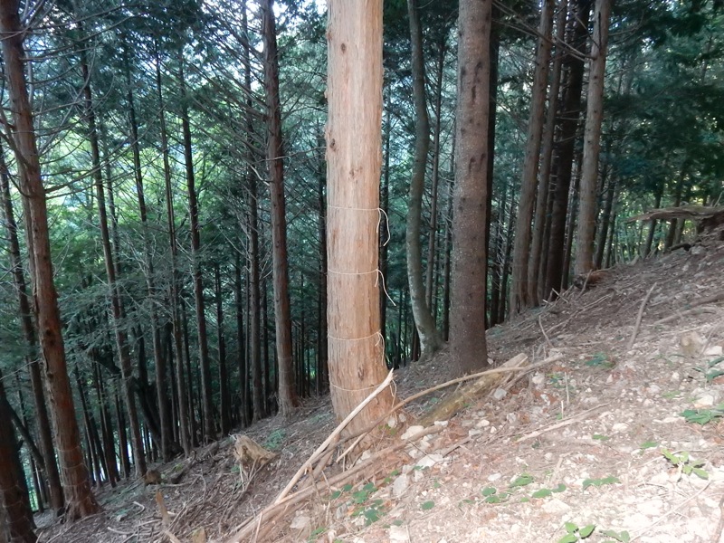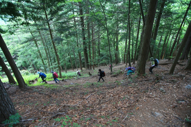 尾根道が終わって、植林地をジグザグに下る道が始まりました。標高差であと200mの下りです。こういう勾配の小さな大きなジグザグ道は「距離が長くなる」という感じがしますが、道の状態がよければ下りのスピードは驚くほど速くなります。この写真のような道なら1時間に600m以上下れます。