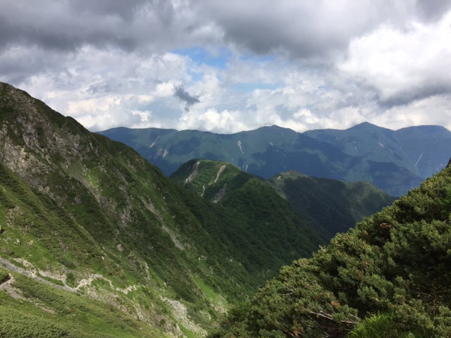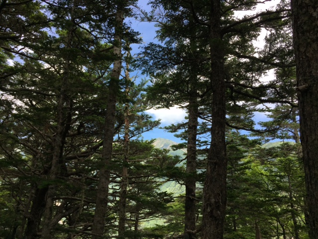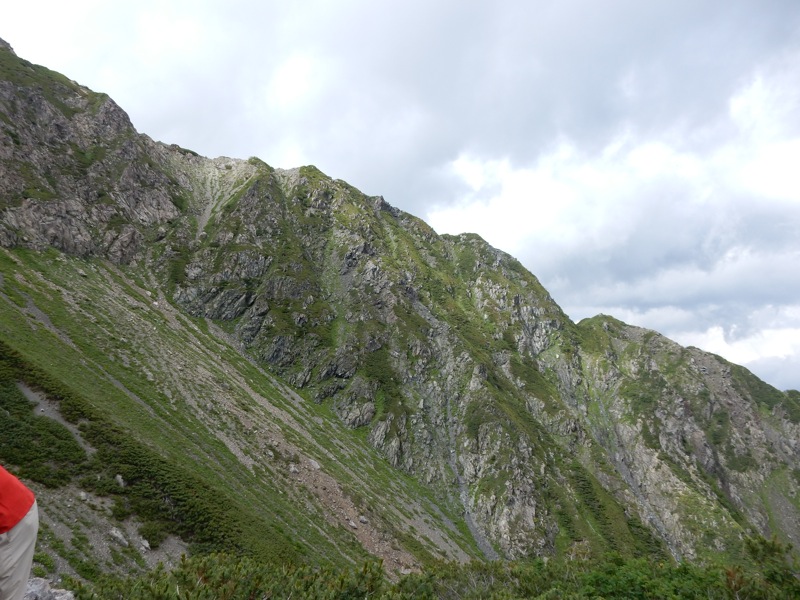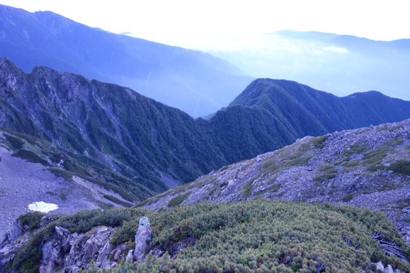 長い尾根の下りも終盤です。赤石小屋を出て約2時間半、初めて10分休憩をとりました。