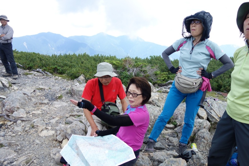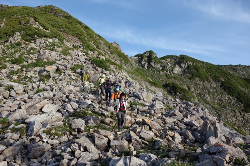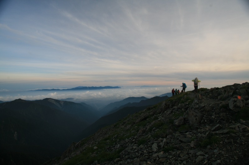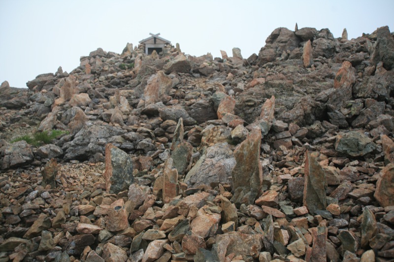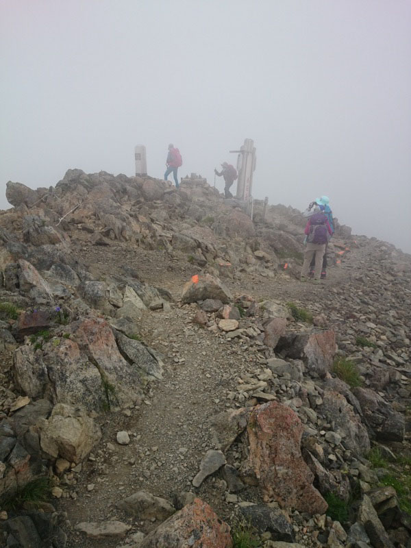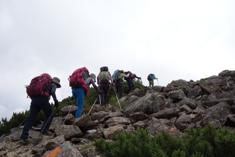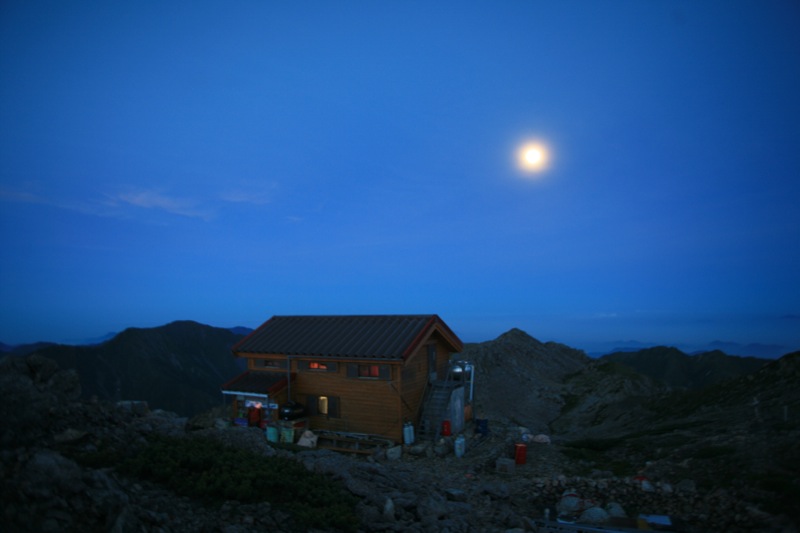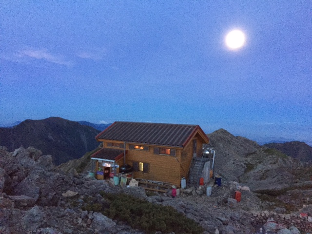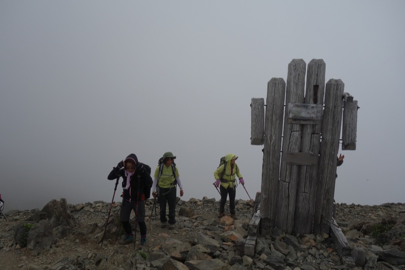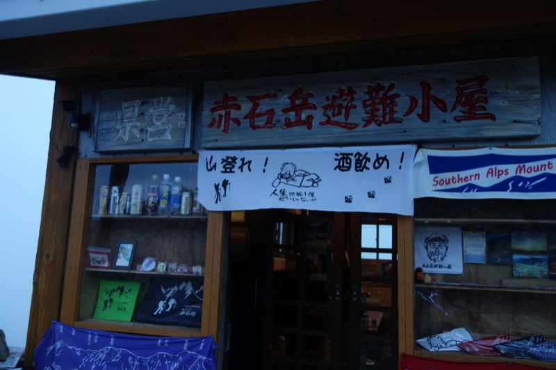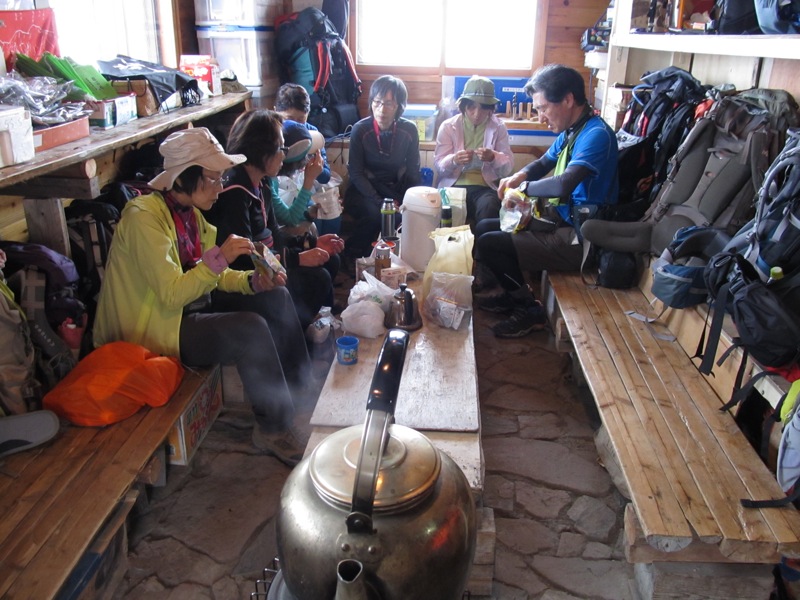 *山頂にあるのは避難小屋ですが、管理人がいて寝具つきだとほかの山小屋の素泊まり料金と同じです。食事は出ませんが、各人の登山食は前月の秋田・駒ヶ岳のときに実験してみて、みなさんそれなりに準備してきています。最悪水だけでも食べられる状態です。悲惨な一夜であったとしても、赤石小屋まで下れば、十分満足な食事ができます。